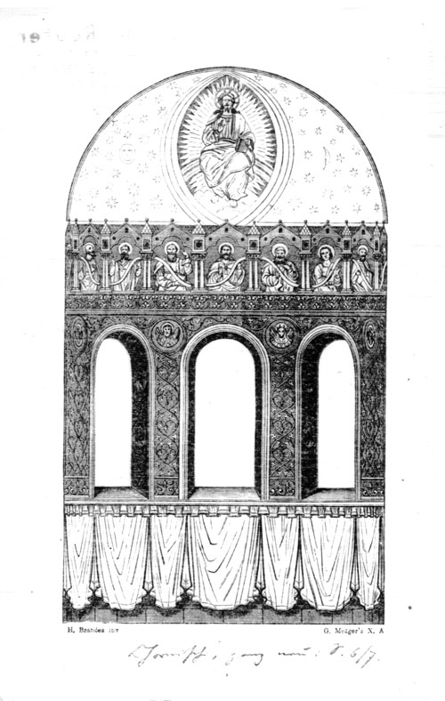 Die alten Wandgemälde in unserem Dome sind al secco, das heisst mit nassen Farben auf trocknem Grunde gemalt, nirgends fand sich ein Mörtelansatz, der eine Frescomanier hätte vermuthen lassen. Bei einem einzigen Bilde, die Ausgiessung des heiligen Geistes, an der Decke im ersten Kreuzgewölbe, zeigten sich eingedrückte Contouren; sie mögen durch Uebertragung entstanden sein. Wenn von Uebertragung in der Kunstsprache die Rede ist, setzt man voraus, dass eine ebenso grosse Zeichnung vorher entworfen wurde, um dann an passender Stelle durchgezeichnet zu werden, wie das in der jetzigen Zeit durchweg geschieht, namentlich bei Fresco-Malereien. Bei unseren alten Gemälden im Dome war das aber gewiss nicht der Fall. Die sicheren Contouren, immer mit sehr flüssiger, rother, tintenartiger Farbe ausgeführt, scheinen gleich an die Wand gezeichnet zu sein. Und wenn auch eine bestimmte Vorschrift als Leitfaden für die Anordnung der Figuren gegeben sein mag und bestimmte Typen innegehalten werden mussten, so ist ein gewisser Begriff von naturalistischer Richtigkeit dem Meister doch fühlbar gewesen; sonst würden nicht auf der Wand noch erkennbare Correcturen vorgekommen sein, die um eine halbe Kopflänge die Gestalten entweder vergrösserten oder verkleinerten.