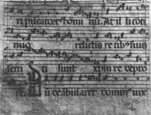Das 31,5 x 42 cm große Pergament und die üblichen neun Noten- und Textzeilen darauf sind gut erhalten. Der Block aus gotischen Hufnagelnoten im Fünfliniensystem und außergewöhnlich exakt geschriebene Gotiko-Rotunda mit drei Zierbuchstaben ist ein Genuß für Kenner und Liebhaber alter Schriften. Zwei der Initialen sind im Sepiaton des Ganzen als schwungvolle Texturabuchstaben gezogen. ln dieser Schriftart druckte Gutenberg seine berühmte 41zeilige Bibel. Wır finden gute steingehauene Textura am Brunnenhaus und an der ehemaligen Klus des Klosters. Der dritte Zierbuchstabe ist ein blau ausgemaltes konturiertes V in der älteren Unzialeschrift. Alle drei sind offensichtlich weniger als Sinnverstärkungen oder Sinnfugen gesetzt, sondem sollen vielmehr Textlücken unter Psalmodiewendungen bzw. die dadurch entstandenen Verdichtungen im Notenbild ausgleichen. Darin beweist sich noch einmal das gute Formgefühl und Können des Schreibers. In der benediktinischen Liturgie war der bereits vom Bischof Ambrosius (374 - 397) eingeführte Wechselgesang zweier Chöre üblich. Nach diesem wurde ein solcher Gesang Antiphon (griech. = Dagegentönendes) und das Chorbuch Antiphonar oder Antiphonale genannt. Daß Ambrosius in unserem Kaiserdom einst besondere Verehrung genoß, beweist seine Darstellung im Vierungsturmfries.