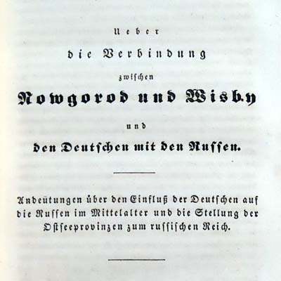 Einleitung. S. 3 - 9. Nowgorod, der einzige Punct, von wo aus das alte Russland mit dem westlichen Europa in Verbindung kommt, S. 4; zuerst mit den Warägern auf feindliche Weise, S. 5, dann von der Insel Gothland aus auf dem Wege des Handels.