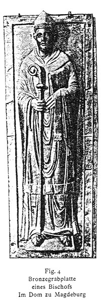 Das früheste Beispiel einer Grabfigur in Sachsen befindet sich auf der Bronzeplatte 1), welche die Ruhestätte des Gegenkönigs Rudolf von Schwaben († 1080) in der Vierung 2) des Merseburger Domes schmückt.