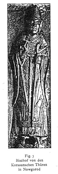 Die Verwandtschaft mit den lateinischen Inschriften der Türen in Nowgorod beweist für diese, die Adelung 1) dem 13. Jahrhundert zuschreibt, Gleichzeitigkeit mit der Entstehung, der Bronzearbeit. Die Ähnlichkeit ist am stärksten bei den sorgfältigeren Inschriften in Nowgorod; die flüchtigeren zeigen vielfache Variationen und epigraphisch ungewöhnliche Bildungen (besonders auffallend die tironische Kürzung für et!) Merkwürdig ist, dass bei im übrigen stärkerer Bevorzugung der Unciale an den Türen das Uncial-N noch nicht verwandt ist.
