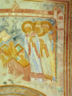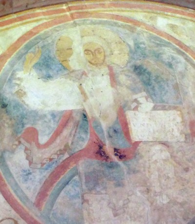 in dem Tonnengewölbe des schmalen Vorchors die Brustbilder von Heiligen (Taf. 86/2, 87/2), in der Apsis die Gestalt des Salvators (Taf. 87/4)