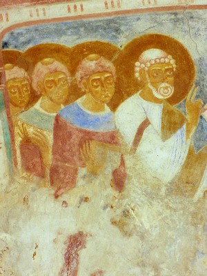 Die, um es gleich zu sagen, sehr byzantinisch anmutende Taufszene des Vierungsgewölbes zeigt in der Mitte eine kreuzförmige Kufe 4, in deren vorderen Enden Täuflinge stehen, während davor eine bärtige, segnende Gestalt — doch wohl Christus — erscheint. Die Gruppen vollfiguriger Gestalten werden links von Petrus geführt, der in der Linken ein aufgeschlagenes Buch mit dem Texte: »Baptizo vos in nomine P.(atris) F.(ilii) S.(piritus)« hält und mit der Rechten einen Segensgestus ausführt; gefolgt von drei Jüngern, denen die gleiche Zahl auf der rechten Seite entspricht. Während im nördlichen Querschiffarm historische Taufszenen dargestellt sind (Petrus tauft Cornelius und sein Haus), handelt es sich bei dieser Szene scheinbar mehr um eine solche symbolischen Charakters, die das Sakrament der Taufe in allgemeinerem Sinne verherrlichen will. Da die Kirche den elftausend Jungfrauen geweiht war (s. o. »ad honorem undecim milium virginum«), dürften die in Rundmedaillons dargestellten Frauen im Tonnengewölbe des Vorchors wohl diese Heiligen darstellen. (Vermutlich befinden sich weitere Szenen dieser Legende unter der Tünche der Gewölbe des Langhauses.) Die leider stark beschädigte Gestalt Christi als Weltenrichter im Halbrund der Apsis läßt aber wenigstens noch deutlich den eindrucksvollen, bärtigen Kopf des Herrn erkennen. Auf der Szene der Arche Noahs und der Taube ist der Kopf Noahs leider stark beschädigt. Zur Ergänzung lassen sich Köpfe in ähnlichen Haltungen aus der Szene der Verklärung Petri (vom nördlichen Querhausarm) heranziehen (Taf.88/2, 87/3).