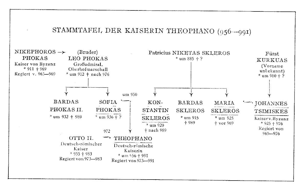 Charakter, Leben und Politik der Kaiserin Theophano, einer der außergewöhnlichsten Frauengestalten der deutschen Kaisergeschichte, werden erst klar, wenn man in ihr die Sprossin der byzantinischen Hochadelsgeschlechter Phokas-Skleros sieht und eben damit die Gegenspielerin der makedonischen Dynastie. Die Familie Phokas hatte in Nikephoros Phokas II. den Purpur schon getragen, und die Familie Skleros, dem Tsimiskes aufs engste befreundet, strebte nach dessen Tode (976) den Purpur an. So sachlich und so witterungssicher auch Theophano in die abendländischen Verhältnisse, in die vielen Aufgaben einer abendländischen, deutsch-römischen Kaiserin hineingewachsen war: ihr Herz mußte, wenn Sie an die Geschehnisse in ihrer Heimat während der Jahre 976 bis 989 dachte, auf Seiten ihrer Familie, also der Rebellen Skleros, sein. Ihr Herz mußte --- entgegen allen falschen