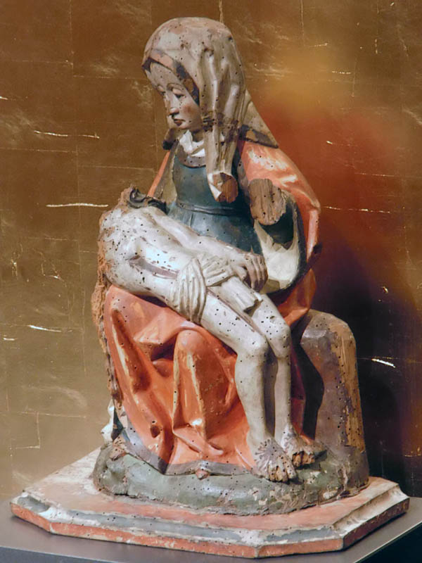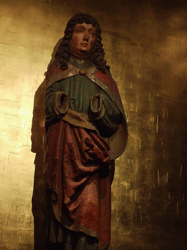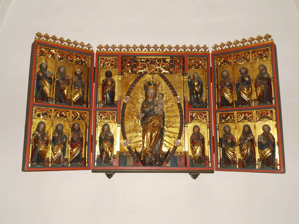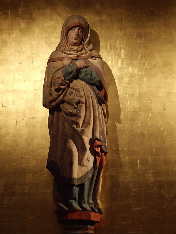 Um den Fuß läuft eine Inschrift mit den Namen der darüber befindlichen unter Baldachinen fast freistehenden etwa 12zm hohen Figuren. Maria mater - Johannes baptist.