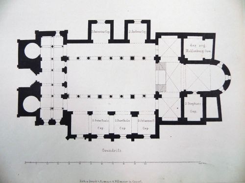 *) Der oben genannte Bogen, der in der Außenmauer, wie bemerkt, scheinbar als Entlastungsbogen auftritt, dürfte etwas näher noch beleuchtet werden müssen. Nach der obigen Erläuterung könnte man annehmen, als habe sich das Mittelschiff in gleicher Höhe und Breite über den Thurm hinaus nach Westen fortgesetzt, und habe hier in verschiedenen Geschossen kirchliche Räume für die speciellen Zwecke der Klosterbewohnerinnen gebildet. So wahrscheinlich dies beim ersten Anblicke auch scheinen mag, so sprechen doch wenigstens mancherlei Umstände dagegen, daß dieser Bogen je dergleichen Zwecke zu unterstützen gedient hat. So sehr wir anzunehmen geneigt sind, daß die Kirche ursprünglich doppelchörig war, daß die Frauen-Empore ursprünglich eine Erweiterung nachWesten haben mußte, etwa wie dies der in Holzschnitt gegebene Grundriß Nr. 1 andeutet, so können wir doch nicht glauben, daß dieser in der Westwand zwischen den Thürmen, dem Triumphbogen gleich groß angelegte Bogen dazu dienen sollte, der Frauen-Empore (Fräulein-Chor) eine Erweiterung nach Westen über die sehr wahrscheinlich später angelegten Thürme hinaus zu ermöglichen. Zunächst sträuben sich die Höhenverhältnisse der betreffenden Räume gegen den Gedanken einer Vereinigung derselben. Aus dem Längenschnitte Bl. 117 ersieht man, daß der Fußboden der Frauen-Empore weit niedriger liegt, als der des Raumes zwischen den Thürmen und über dem Paradiese, welcher letzterer doch die nächste Erweiterung der Frauen-Empore bilden müßte; man könnte zwar denken, das Portal sei zu jener Zeit noch nicht angelegt gewesen, und es wären beide Räume durch nichts behindert gewesen, gleiche Höhe im Fußboden zu haben, was wieder sehr glaublich erscheint, dann müßte man aber doch in den oberen Höhenverhältnissen Gleichheit finden; die Frauen-Empore müßte also bis zur Höhe des Triumphbogens hinansteigen, welches, wie der Kägenschnitt zeigt, bei weitem nicht der Fall ist. Auch hierüber könnte man hinwegkommen, wenn man die mittlere Säulenreihe der Emporen und die durch sie getragenen Kreuzgewölbe als später eingesetzt annimmt, was wiederum sehr wahrscheinlich ist, da die Kapitäle der Mittelsäulen aus späterer Zeit sind, als die der Arkaden der Ostseite der Empore. Wären diese beiden Facta, welche jetzt die Sache unmöglich scheinen lassen, also als spätere Veränderungen anzusehen, so möchte die Frauen-Empore eine angemessene Größe und Form gewinnen, wenn wir uns nach West zu dieselbe dann durch eine große Apsis geschlossen denken. Aber leider ist doch noch ein Umstand der gegen die Richtigkeit der Annahmen spricht. Wenn nämlich der große Bogen in der Westwand der Thürme für die Erweiterung der Frauen-Empore dienen sollte, so müßte nothwendig in der Ostwand zwischen den beiden Thürmen ein ebenso großer Bogen sein, um Thurm- und Emporen-Räume zu einem gemeinsamen Raume zu vereinigen. Hier ist aber kein derartiger Bogen, und das Mauerwerk steigt in gleicher Stärke und ohne irgend welche Unterbrechung bis zu der Glockenstube empor. Außerdem spricht der Umstand gegen die Annahme eines jemaligen Vereinigtseins der Räume zwischen den Thürmen und der Frauen-Empore, daß im Thurme die Mauern an den betreffenden Stellen noch völlig rohes Bruchsteinmauerwerk zeigen, welches nie einen Ueberzug von Putz hatte. Demnach war hier nie ein Raum, der von den Stiftsfräulein zu gottesdienstlichen Zwecken benutzt war. Wir erlauben uns hinzuzufügen, daß der große Bogen der Westseite, wie man im Innern des Thurmes gut sehen kann, aus Quadermauerwerk sorgfältig ausgeführt ist, daß er bis an die Vorderfacade hindurchgeht, und durch eine weit schmälere als die Turmmauer bündig mit der Außenseite zugemauert ist, so daß sich im Innern des Thurmes eine große Nische bildet. Ein Kämpfergesims mir der echt romanischen steilen Hohlkehle fehlt nicht. Daß der Bogen die ganze Stärke der Thurmwand einnimmt, kann man von innen bemerken, indem man an vielen Stellen zwischen Quaderbogen und Bruchsteinausmauerung hindurchsehen kann.