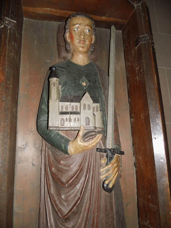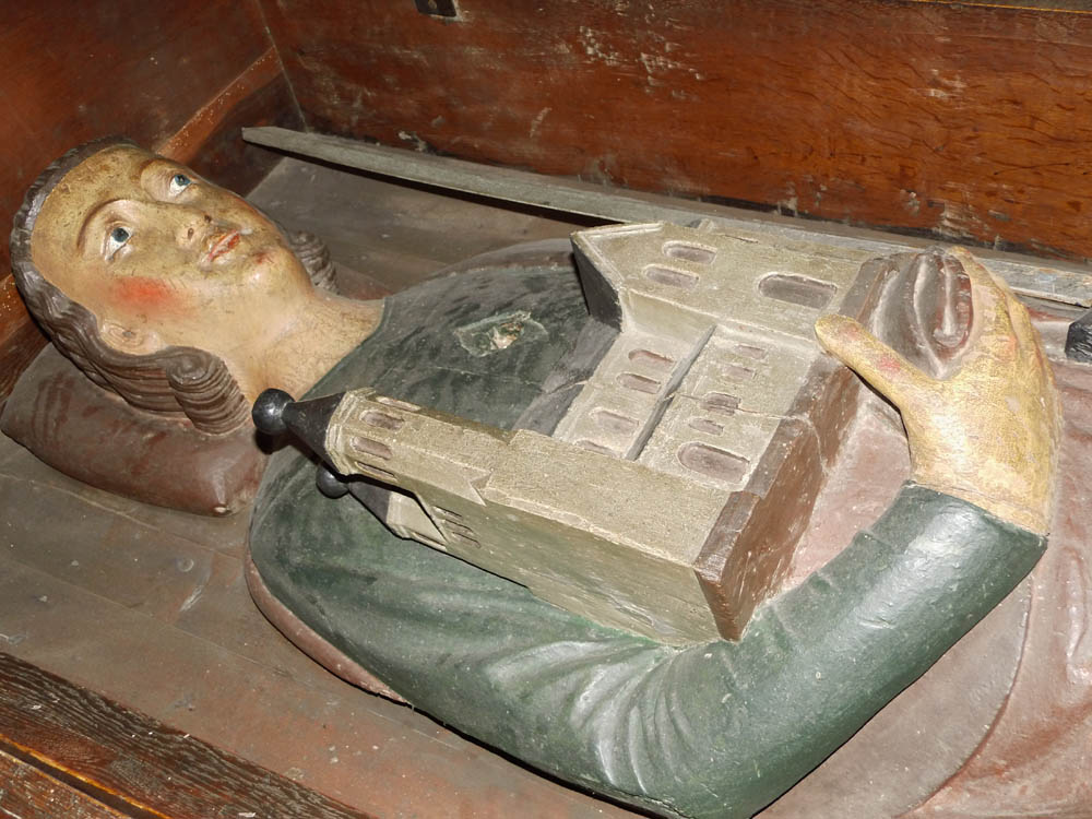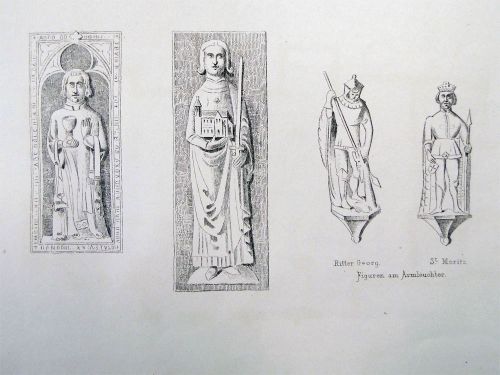 Jede dieser beiden letztgenannten Figuren ist 2 Mal da, je vorn und hinten. Auf dem Schilde des St. Moritz ist einmal das egyptische † zu erkennen. Die sonst rohen 3 Füße tragen in Hochrelief ebenfalls Figuren, scheinbar Knappen darstellend.