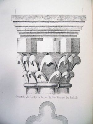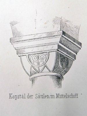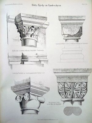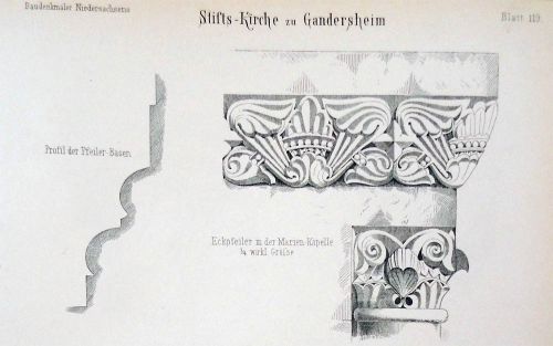 Ein Blick auf die Details, welche theilweise so lebhaft an die nach ganz antik gehaltenen Säulenkapitäle erinnern, die sich in Hildesheim unter den alten Domresten sowie in der Krypta der Moritzberger Kirche (1059) finden, die Verbindung solcher Kapitäle mit Basen, an welchen sich Eckblätter befinden, beweist, daß bei jedem Neubau willkürlich alte und neue Werkstücke durcheinander gewürfelt sind. Nur das neue Kleid, welches Ende des XII. Jahrhunderts der Kirche angelegt wurde, zeigt sich überall unverkennbar.