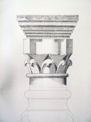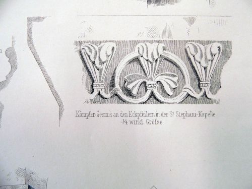 Außenmauer der Querschiffflügel um ein Weniges hinausgerückt gedacht werden. Für Ersteres, daß die Kapellen nämlich lediglich Werk des XII. Jahrhunderts sind, sprechen die auf Blatt 119 rechts gezeichneten Details, welche dieselben Bildungen zeigen wie die auf Blatt 121 unten gezeichneten Gesimse etc. Jene gehören nämlich den im XlI. Jahrhundert behuf der Ueberwölbung vorgelegten Pfeilervorlagen in den Kapellen an. Solche Pfeilervorlagen mit ganz ähnlichen Kämpfergesimsen und Gewölbeanfängen sollen vor der letzten Restauration auch noch an den Pfeilervorlagen des Mittelschiffes vorhanden gewesen sein (siehe Holzschnitt Nr. 3).