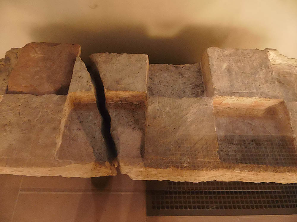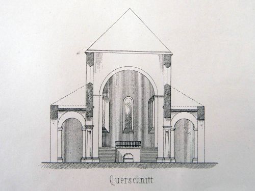 Diese für Aufnahme von Kreuzgewölben bestimmten Pfeilervorlagen sind bei der gedachten Restauration 1850 entfernt. Daß ferner die bezeichneten Außenmauern weiter hinaus gerückt waren, beweisen die jetzt zugemauerten Absidenöffnungen. Von diesen ist nämlich an den Außenseiten durch die jetzigen Mauern ein Stück abgeschnitten.