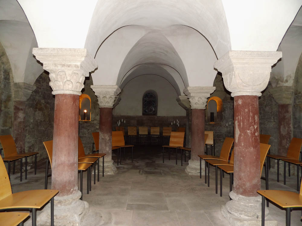 Zu Seiten des Chores, welcher in fast voller Breite durch eine halbkreisförmigeApsis abgeschlossen wird, liegen Kapellen, deren Außenwände die Fortsetzung der Querschiffmauern bilden. Diesen haben sich früher noch zwei schiefwinklige Kapellen östlich angereiht, deren eine an der Südseite nicht mehr vorhanden, die andere mit der nördlichen erstgenannten Kapelle zu einem Raume verbunden ist. Alle letztgenannten Räume sind überwölbt, jedenfalls aber erst nach dem dritten Brande. Die zur Unterstützung der Gewölbe vorhandenen Pfeilervorlagen sind ohne Frage, nach dem Ornament der Kapitäle zu urtheilen, Arbeiten des XII. Jahrhunderts. Unter dem Chor, in voller Ausdehnung desselben und bis in die Mitte der Vierung sich erstreckend befindet sich eine dreischiffige Krypta, deren 12, durch 6 freistehende Säulen und 6 Halbsäulen getragene Kreuzgewölbe durch eine gerade Wand abgeschlossen und von der einfachen Kuppelwölbung der Apsis getrennt werden.·