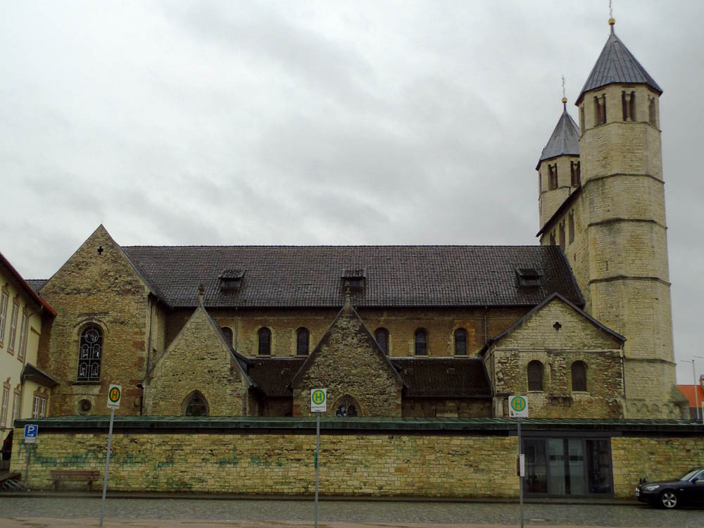 angedeuteten Form dem Wesen nach ähnlich gewesen sein. Der Hauptsache nach soll hiermit nur die Form der doppelchörigen Anlage betont werden. Schon die Form der beiden, in gleicher Breite das Langhaus sowohl östlich als westlich begrenzenden Querschiffe läßt auf die Anlage einer doppelchörigen Kirche schließen, und zwar hier um so mehr, als zu derselben Zeit in dem nahe gelegenen Hildesheim der Bischof Bernward sein Hauptwerk, die St. Michaeliskirche, in doppelchöriger Form erbaute. Für die hier gezeichnete Form der großen Abside nebst Umgang sowie der beiden kleineren Absiden finden sich an dem Bauwerke selbst keinerlei Hinweise, und dürften nur die oben für die Annahme einer doppelchörigen Form angeführten Gründe als maßgebend angesehen werden.