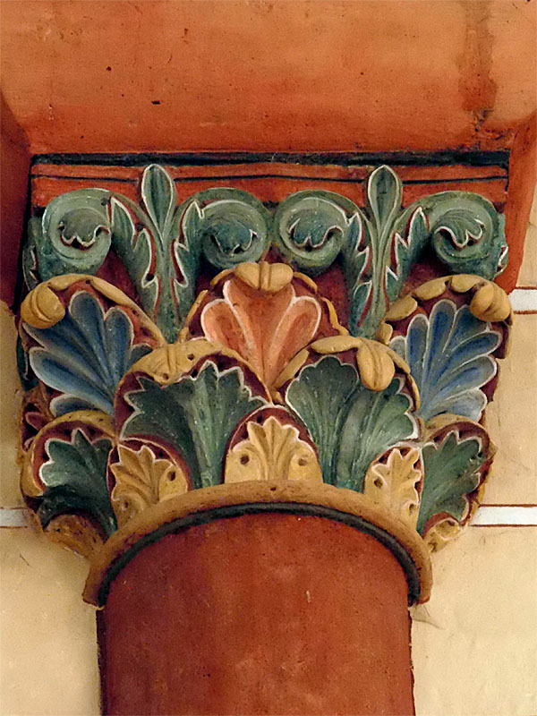 besonders fesselt. Die Wand wird durch 2 Eck- und 2 Mittelpfeiler in drei gleiche Theile getheilt; je zwei benachbarte Pfeiler sind durch 5 Bögen mit einander verbunden. Die Pfeiler haben reichgebildete Capitäle, aus welchen, ohne daß ein Abakus einen horizontalen Schluß bildete, die Profilirung des Bogenfrieses hervorwächst. Die Bögen des Frieseszwischen den Pfeilern werden durch Consolen getragen, welche an Höhe den Pfeilercapitälen gleichen und ebenso wie diese eines horzontalen Gesimsschlusses ermangeln.
