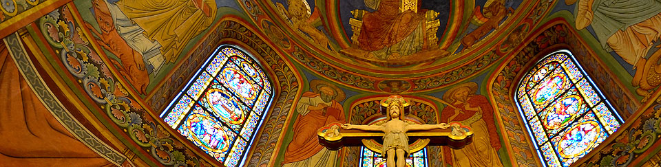 Wie der Meister von Königslutter aus dem damaligen Fundus von Gestaltsvorbildem aus antiken Jagddarstellungen, mythischen Bildnissen, dekorativem Relief und klassischen Kapitelformen sein Gesamtbildwerk an der Außenapsis komponierte, so schuf Essenwein sein Ausmalungskonzept aus den vorgefundenen Resten alter Malerei im Chor und Westgewölbe und sinngemäßen Ergänzungen mit Bildzyklen der gleichen Zeit. lm Langhaus der Basilika, das dem irdischen Bereich zugeordnet ist, symbolisieren vier Personifikationen der Tageszeiten - Morgen, Mittag, Abend und Nacht - die mit der Schöpfung beginnende und endende Zeit und die ihnen beigegebene Sonne den dauemden Wechsel irı ihr. Die flankierenden Tiere deuten auf das zweite Charakteristikum der Schöpfung, den Raum. Irı anderer Folge flarıkieren und verstärken sie auf der Südseite die Symbolisierungen der Elemente Feuer, Luft, Wasser und Erde. Nach den von Hugo von St. Victor (1096 bis 1141) aufgestellten Stufen des Erkennens in der geistlichen Auslegung der geschaffenen Welt soll der Mensch über Schauen, Denken und Erfassen hier zu dem Resultat geführt werden: Die gesamte Schöpfung lobt Gott wie jedes Werk seinen Meister lobt, und der Mensch möge voll in dieses Lob einstimmen, dem im Querhaus sich die himmlischen Heerscharen anschließen. Als Mittler zwischen Himmel und Erde verbinden sie zugleich zum Chor, dem Allerheiligsten. Dort ergänzte Essenweins Entwurf die Darstellung des Jüngsten Gerichts durch die des Himmlischen Jerusalems, des neuen Paradieses, und der Tugenden, durch deren Einhaltung der Mensch jenes anstreben soll.