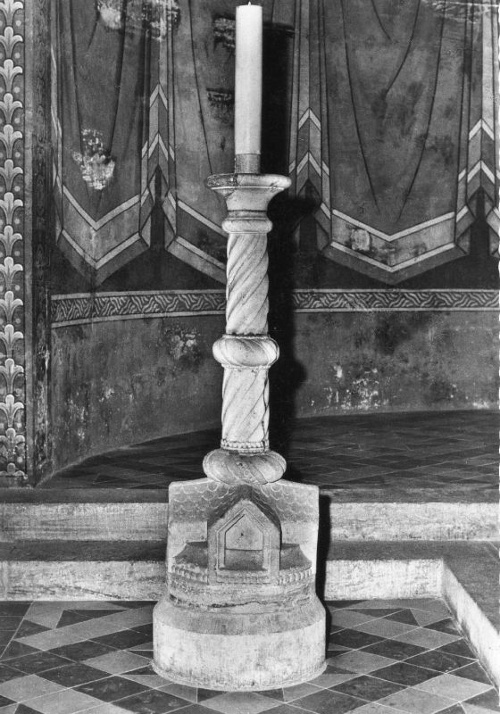 Des Kreuzes Schaft steht auf einem Kapitell, das dem der achten Kreuzgangsäule nachgebildet wurde. Über den Schaftring der Säule legen sich 24 vergoldete Blättchen. Die Säule, durch Ringe dreigegliedert, basiert auf einem ebenfalls dreigegliederten Sockel und durchdringt die Platte eines Tisches mit 4 Säulenfüßchen. Der Tisch symbolsiert den Schaubrottisch (1 Kön 7.48) und ähnelt dem des herodianischen Tempels, der von Titus nach Rom gebracht und auf dem Titusbogen abgebildet wurde. Die sich wieder aus drei und vier ergebene Siebenzahl ist hier die heilige Zahl des Alten Bundes, auf dem der durch das Blut Christi besiegelte Neue Bund beruht. Auch die Fünf, die sich aus den vier Tischbeinen und der Säule ergibt, symbolsiert Parallelen der beiden Testamente. Der Alte Bund ist in den fünf Büchern Mose belegt und hat fünf Bundesbeschlüsse: Adam-, Noah-, Abraham-, Jakob- und Mosebund. Diesen entsprechen im Neuen Bund die fünf Geheimnisse Christi, die Menschwerdung, die Leidenszeit, Auferstehung, Himmelfahrt und Wiederkunft. Der Gedanke an die fünf Brote der Brotvermehrung macht das wie ein Altaraufsatz wirkende Tischchen zu einem Zeichen des Abendmahls. Die Säule, im Alten Testament ein Symbol der Beständigkeit Gottes, bezeichnet in Werken frühchristlicher Kunst oft die Kirche selbst.