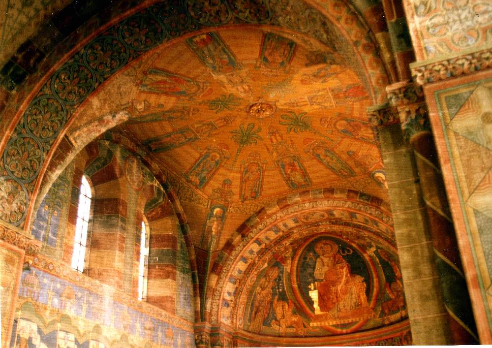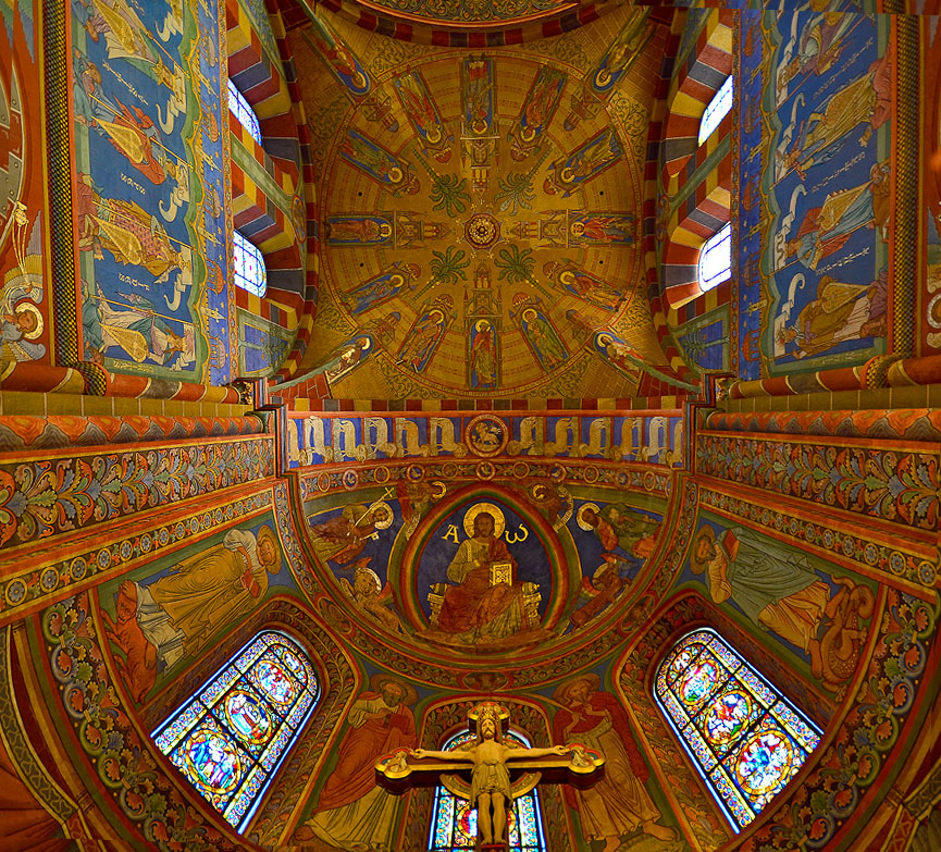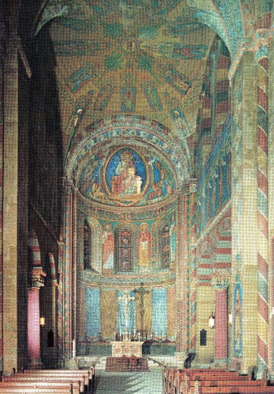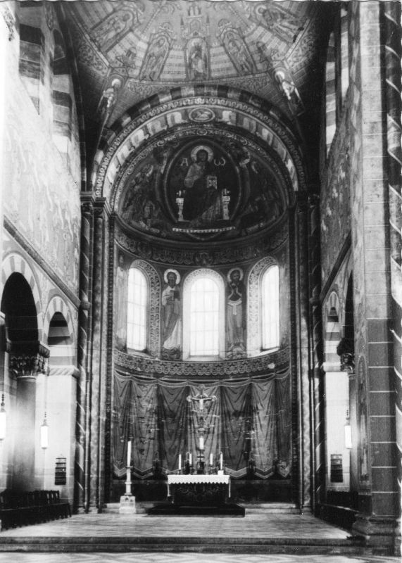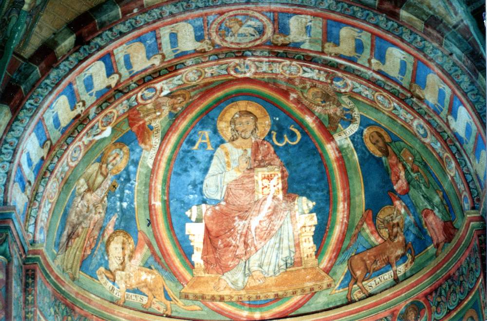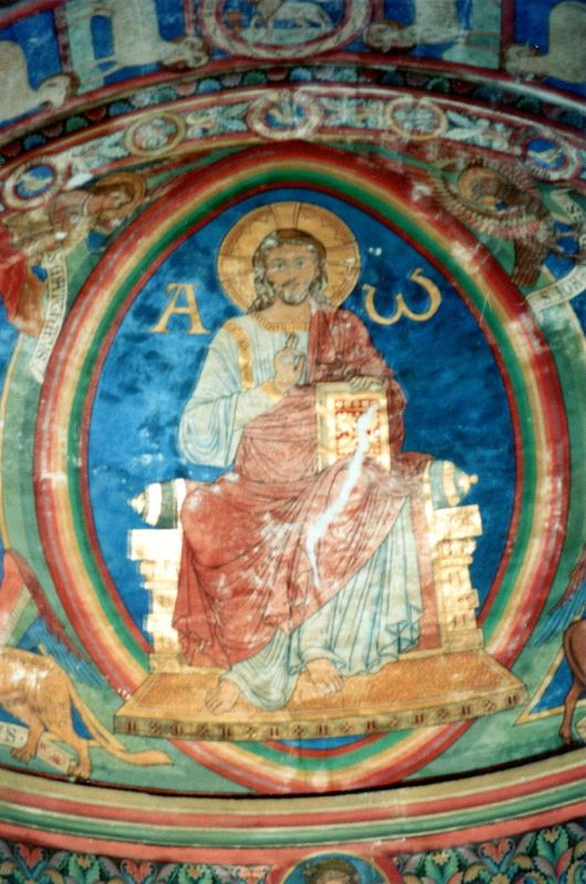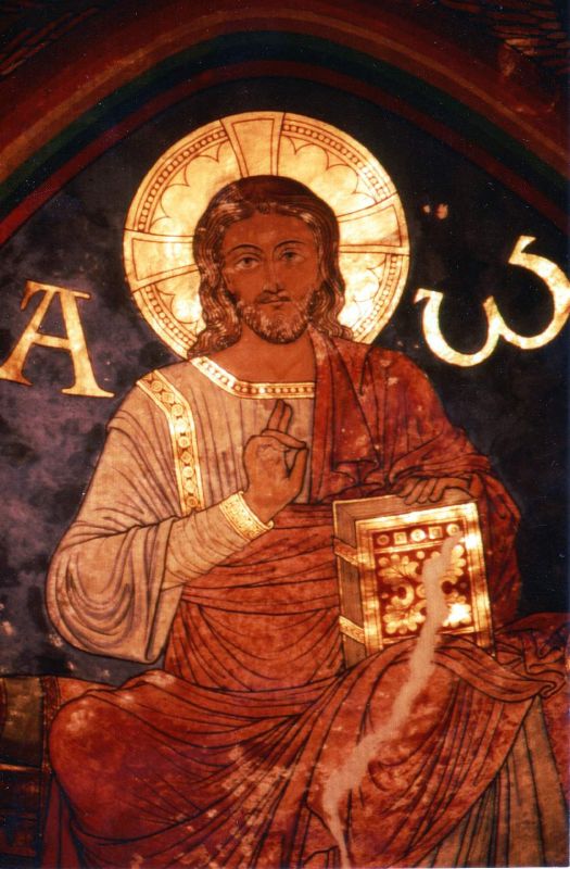 Die hier aufgefundene, wie schon vorhin angedeutet, und fast vollständig erhaltene Vermalung zeichnete dem Künstler genau den Weg vor, welchen er bei seiner Arbeit zu gehen hatte. Ln der Halbkuppel zeigt sich, umgeben von einer farbenprächtigen Mandorla, der thronende Christus, der die rechte Hand segnend erhebt und mit der linken das Buch des Lebens umfaßt. Außerhalb der das Haupt umgebenden Aureola sieht man das A und das O, in Bezug auf die Schriftworte: Ich bin das A und das O, der Anfang und das Ende, der Erste und der Letzte.