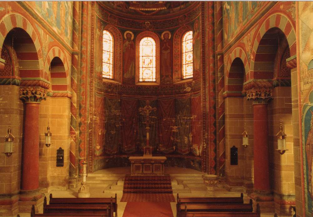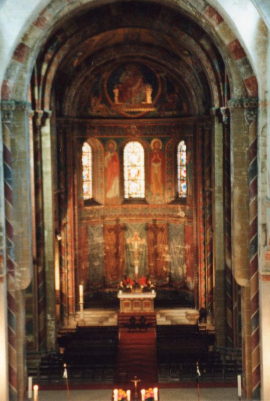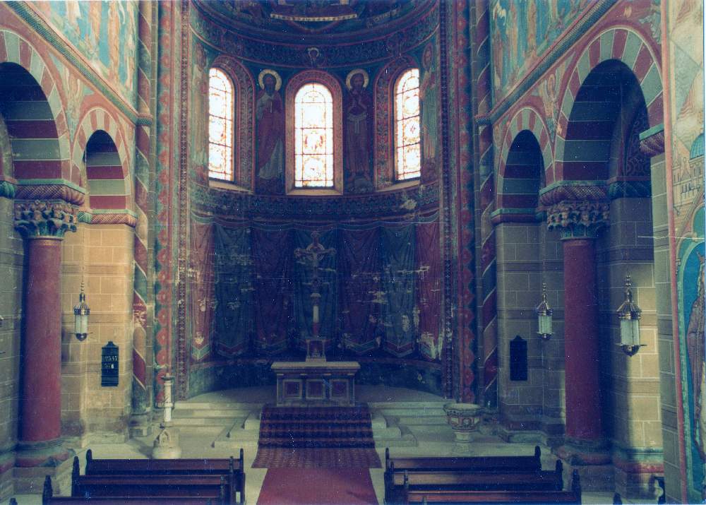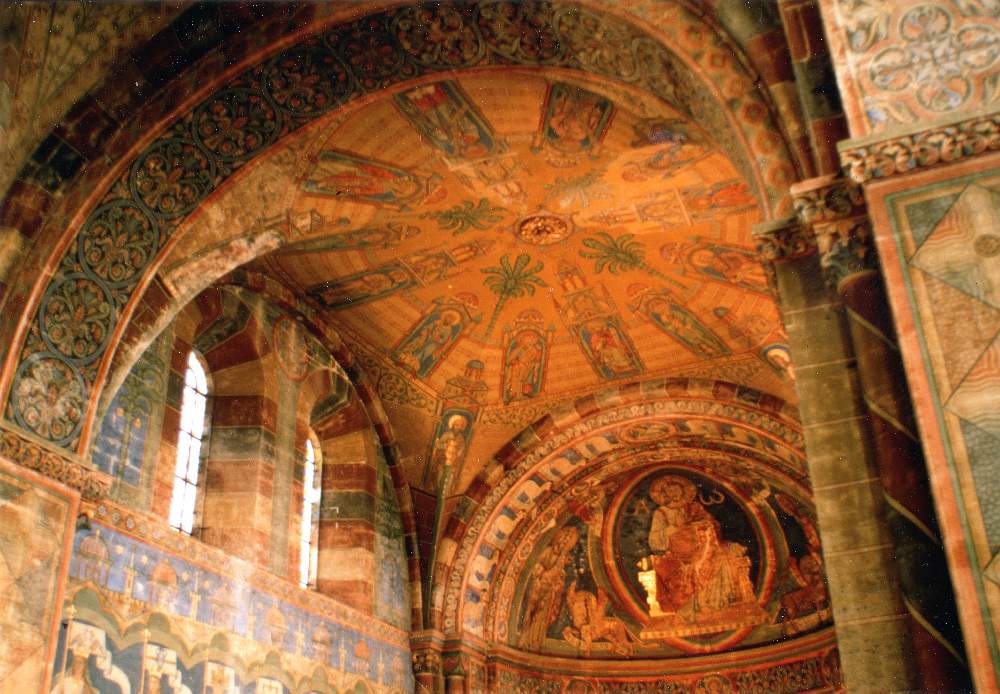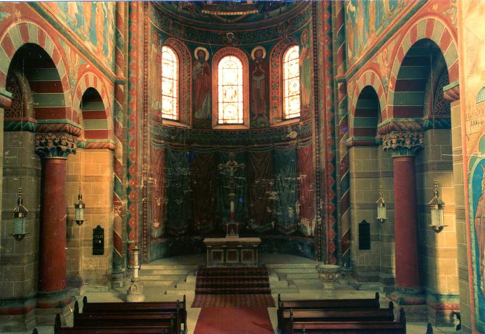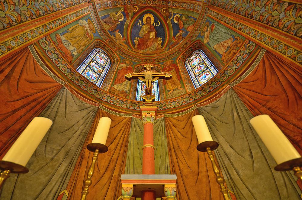 Die hier aufgefundene, wie schon vorhin angedeutet, und fast vollständig erhaltene Vermalung zeichnete dem Künstler genau den Weg vor, welchen er bei seiner Arbeit zu gehen hatte. Ln der Halbkuppel zeigt sich, umgeben von einer farbenprächtigen Mandorla, der thronende Christus, der die rechte Hand segnend erhebt und mit der linken das Buch des Lebens umfaßt. Außerhalb der das Haupt umgebenden Aureola sieht man das A und das O, in Bezug auf die Schriftworte: Ich bin das A und das O, der Anfang und das Ende, der Erste und der Letzte.