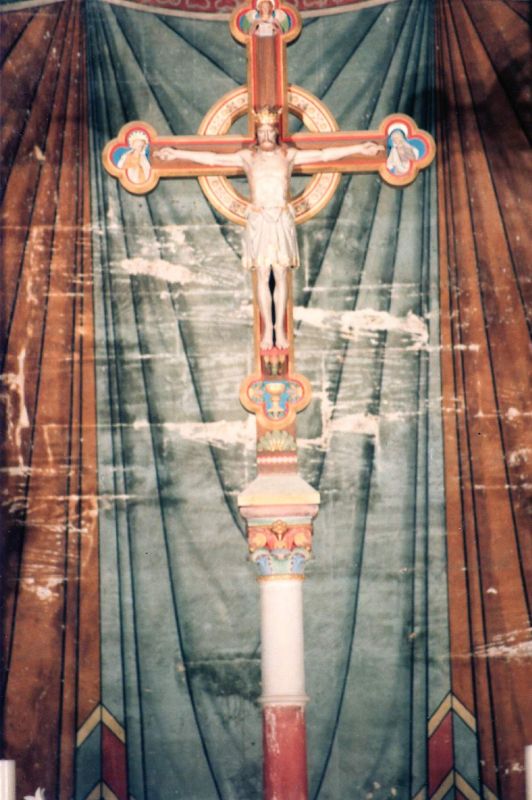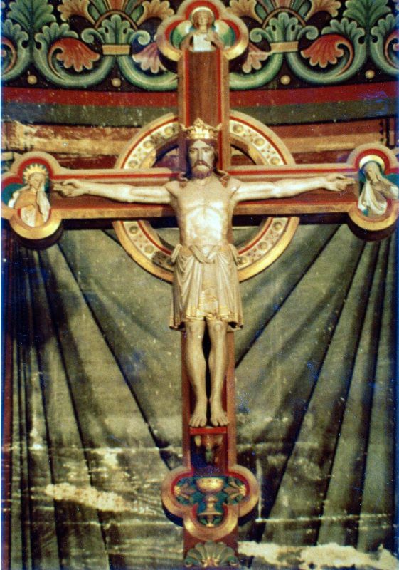Der Gekreuzigte daran wirkte immer erbämılicher und glich, wie auch bei heute modernen Darstellungen, eher einem schmachvoll gerichteten Verbrecher als dem Heiland. Die Hoffnungen auf den starken christlichen Einheitsstaat hatte sich nicht erfüllt. Die Triumph-, Sühne-, Mahn- und Grabeskirche Kaiser Lothars ist aber monumentales Zeugnis eines kräftigen Glaubens an dieses Reich als Vorstufe des Gottesreiches auf Erden. So ist es also recht, daß dieses Kreuz nicht das Schmerzhaftblutige des leidenden Menschen, sondern den durch den Gottessohn überwundenen Tod darstellt. Ohne Nägel und Wundmale, mit einer Königs- statt Dornenkrone, steht Christus vor dem Kreuz, aufrecht und festen Blicks. Aus den geöffneten Augen schaut der unsterbliche Logos, sagt die Auslegung. Auch der verhöhnende Kreuzestitel wurde weggelassen. Die Gloriole durchdringt als zentraler Reif die vier Kreuzarme und bildet somit einen großen Kreuznimbus. Er ist durch Kreuzrosetten und Edelsteindarstellungen, wie sie auch der Thronsitz des Herrn in der Apsiskalotte darüber zeigt, kostbar gestaltet.