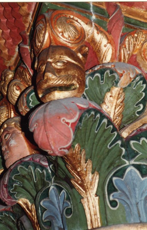 ln den Dreibogenfeldern sind in feinster Schnitzarbeit drei Halbfiguren und der Kelch dargestellt. Oben sieht man den nach Offb. 22.16 gesandten Engel mit dem Zeugnis des Herrn in den Händen, links die Symbolfigur der Sonne und rechts die des Mondes, die mit Tüchern die Tränen trocknen und die seit dem 6. Jh. auf keiner Kreuzigungsdarstellung bis zur Lotharzeit fehlen. Auch im Evangeliar Heinrichs des Löwen flankieren sie das Kreuz und sind gleichfalls auf rot eingefaßtem blauem Grund, also in die Farben Christi eingebettet. Das Blau entspricht seiner himmlischen, das Rot seiner irdischen Natur. Der goldene Kelch im unteren Feld ist von Pflanzenornamenten umgeben, das wie die siebenriefige Palmette darunter, das Holz des Lebens versinnbildlicht. Die Siebenzahl vereint die Symbolzahlen für Gott und für die Welt und war beim Bau dieser Kirche bedeutungsvoll. Ein Kugelfries mit acht Kugeln auf jeder Seite zeigt am Anfang des Kreuzes an, daß der Gekreuzigte sein irdisches Dasein beendet hat. Acht ist in der christlichen Zahlensymbolik des Mittelalters die Zahl der Vollendung.