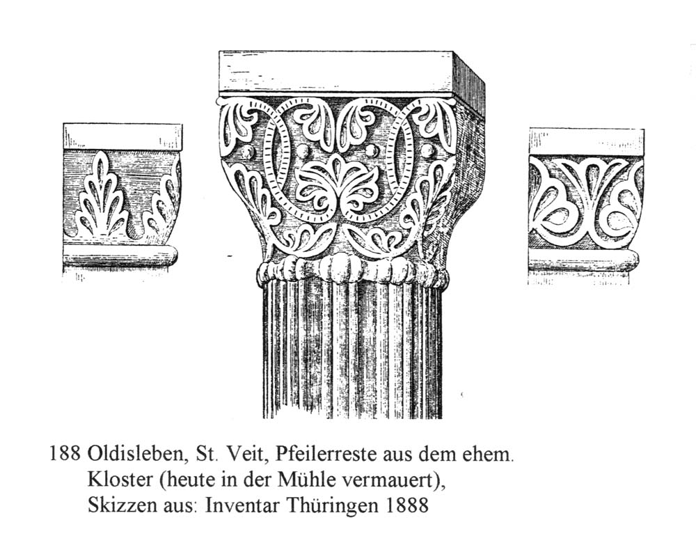- Abb. 188 Oldisleben, St. Veit, Pfeilerreste aus dem ehem. Kloster (heute in der Mühle vermauert), Skizzen aus: Inventar Thüringen 1888