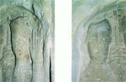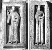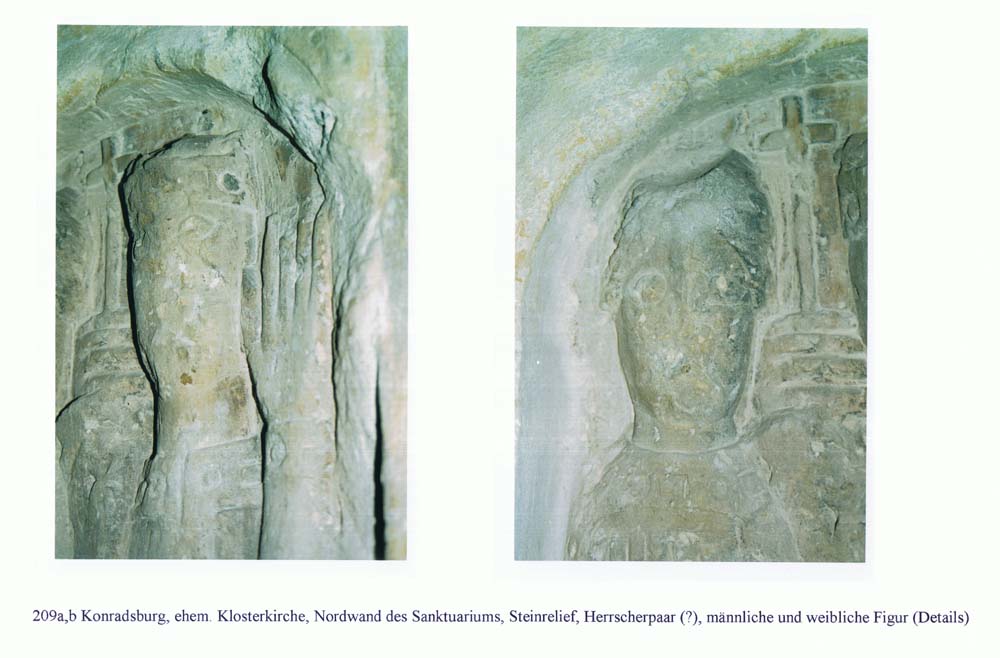 - Abb. 209a,b Konradsburg, ehem. Klosterkirche, Nordwand des Sanktuariums, Steinrelief, Herrscherpaar (?), männliche und weibliche Figur (Details)