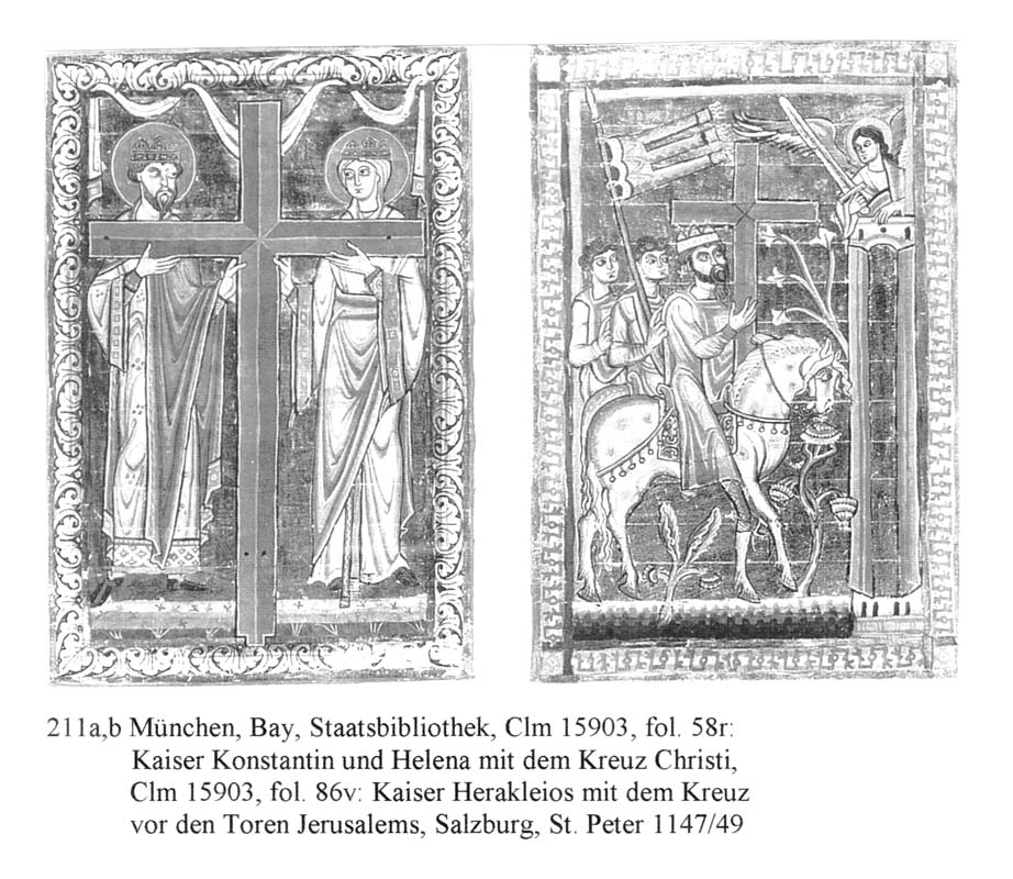 - Abb. 211a,b München, Bay. Staatsbibliothek, Clm 15903, fol. 58r: Kaiser Konstantin und Helena mit dem Kreuz Christi; Clm 15903, fol. 86v: Kaiser Herakleios mit dem Kreuz vor den Toren Jerusalems, Salzburg, St. Peter 1147/49