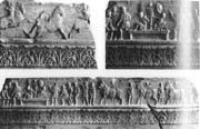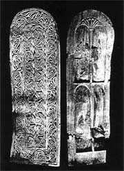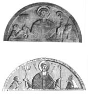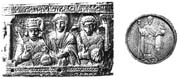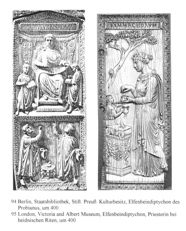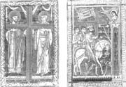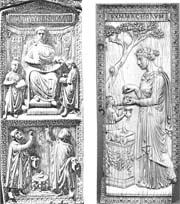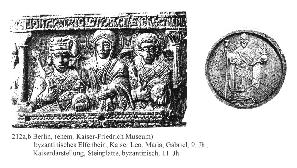- Abb. 212a,b Berlin, (ehem. Kaiser-Friedrich Museum), byzantinisches Elfenbein, Kaiser Leo, Maria, Gabriel, 9. Jh.; Kaiserdarstellung, Steinplatte, byzantinisch, 11. Jh.