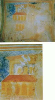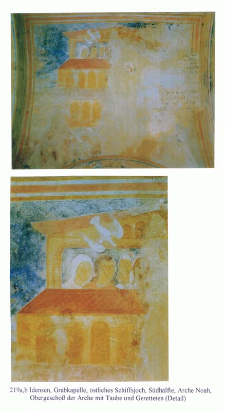 - Abb. 219a,b Idensen, Grabkapelle, östliches Schiffsjoch, Südhälfte, Arche Noah, Obergeschoß der Arche mit Taube und Geretteten (Detail)