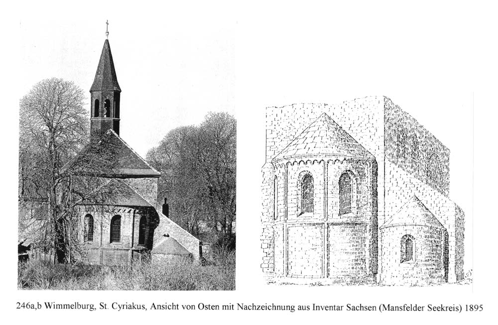 - Abb. 246a,b Wimmelburg, St. Cyriakus, Ansicht von Osten mit Nachzeichnung aus Inventar Sachsen (Mansfelder Seekreis) 1895