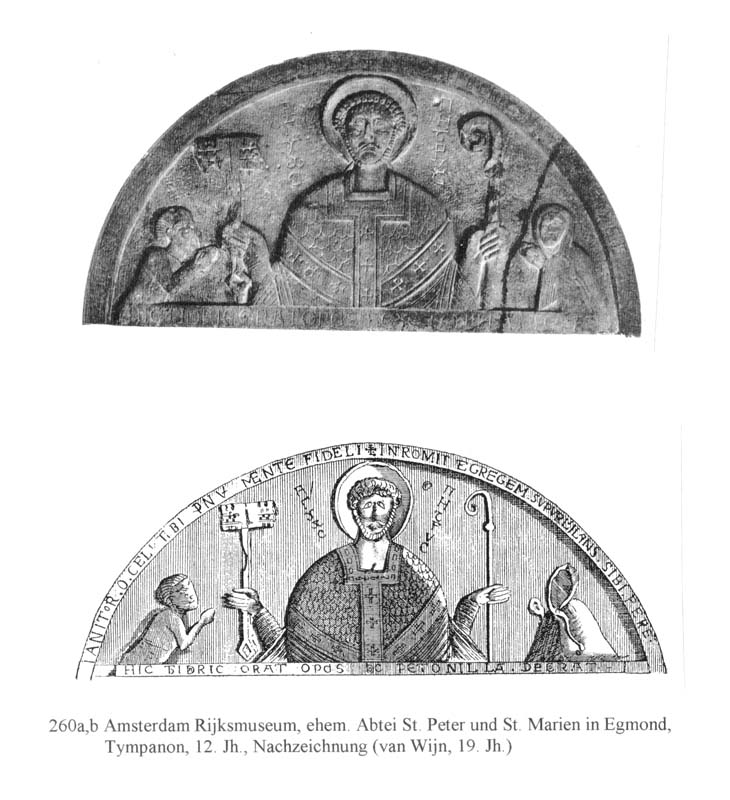 - Abb. 260a,b Amsterdam Rijksmuseum, ehem. Abtei St. Peter und St. Marien in Egmond, Tympanon, 12. Jh., Nachzeichnung (van Wijn, 19. Jh.)