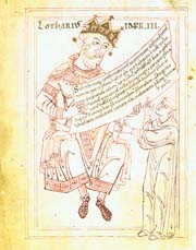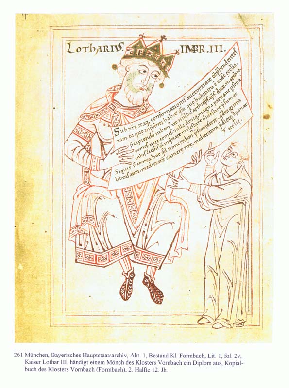 - Abb. 261 München, Bayerisches Hauptstaatsarchiv, Abt. 1, Bestand Kl. Formbach, Lit. 1, fol. 2v, Kaiser Lothar III. händigt einem Mönch des Klosters Vornbach ein Diplom aus, Kopialbuch des Klosters Vornbach (Formbach), 2. Hälfte 12. Jh.