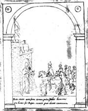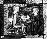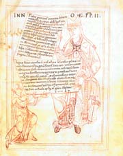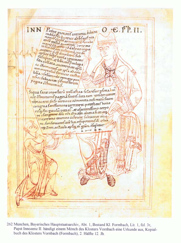 - Abb. 262 München, Bayerisches Hauptstaatsarchiv, Abt. 1, Bestand Kl. Formbach, Lit. 1, fol. 3r, Papst Innozenz II. händigt einem Mönch des Klosters Vornbach eine Urkunde aus, Kopialbuch des Klosters Vornbach (Formbach), 2. Hälfte 12. Jh.
