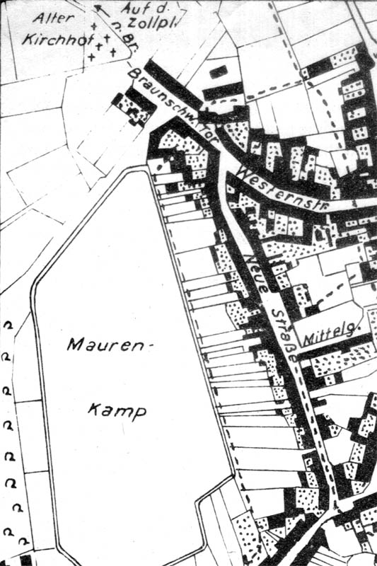 Nach der Stadtbeschreibung von 1761 (3) war damals noch der größte Teil der Stadtmauer vorhanden. Nur im Nordosten zwischen dem Kuhtor und den Gärten des Fürstlichen Amtes bestand sie nicht mehr. Das Amt hatte eigene Befestigungsanlagen. Außerhalb der Stadt lagen damals nur die Clus, das Armenhaus der Stadt an der Ecke Braunschweiger Straße/Parkstraße, das Zollhaus am Zollplatz, Ecke Braunschweiger Straße, und die Kämmerei-Plantage am Ochsendorfer Weg.