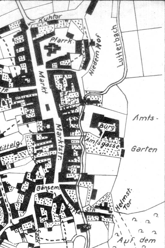 Die Stadt muß von Anfang an, also seit dem Beginn des 15. Jahrhundert, eine Mauer besessen haben, die ursprünglich aber wahrscheinlich nur zum Schutz des Marktes und der Marktstraße angelegt sein wird. lm Osten verlief sie wahrscheinlich an der Lutter entlang. 1454 ist in einer Urkunde des Stifts von Königslutter von einer neuen Mauer die Rede. Sie erwies sich als notwendig, weil sich Neubürger aus Schoderstedt an der Neuen Straße angesiedelt hatten. Später wurde der Mauerring beträchtlich erweitert und umschloß wahrscheinlich auch die herzogliche Burg, die natürlich auch eigene Befestigungsanlagen besaß, und die beiden Adelshöfe in der Stadt, den Niedernhof im Nordosten und den von Schwarzkoppenschen Hof im Südosten.