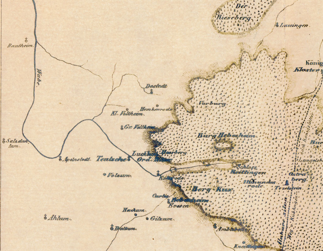 Hesus, Feldherr der Ostphalen, welche in den damaligen Zeiten ihren Sitz in unserer Gegend hatten, wird gleichfals sich mit seinem Korps auf der Nähe aufgehalten haben. Denn obgleich diese vor 4 Jahren nebst den Ungariern sich unterworfen hatten, so war doch nichts leichter, als so bald sie nur ihren Vortheil erfahren, oder sonst gedrungen wurden, wieder abfielen. Die unerhörte Grausamkeit, die vom Karl im vorigen 782 Jahr gegen die Sachsen war verübet worden, wodurch der Aufstand unter den Sachsen allgemeiner wurde und alle zu den Waffen griffen, läßt uns daran nicht zweifeln, daß die Ostphalen mit denen Westphalen gemeinschaftliche Sache gegen den Feind gemacht haben; und der Zug Karls des Grossen durch unsere Gegend bestätigt dieses noch mehr.