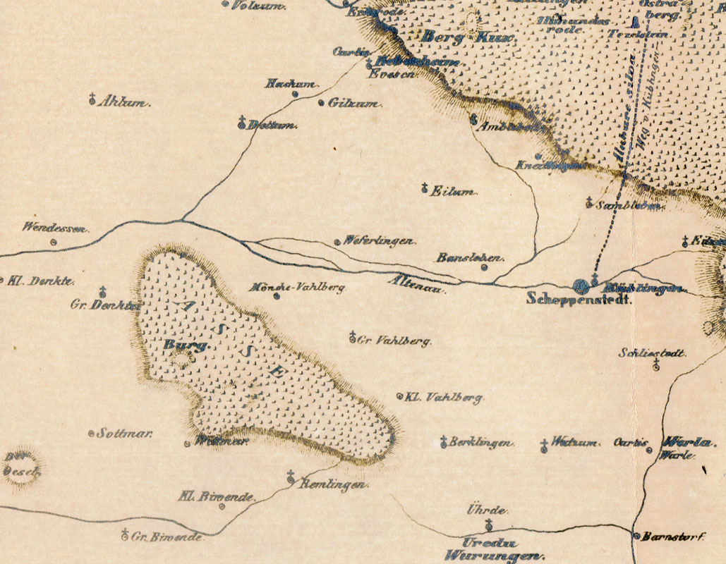 Nach der schon 722 zu Worrns beschlossenen Unterwerfung des noch heidnischen Sachsens unter die Herrschaft der Franken trat im Anfange des neunten Jahrhunderts der Zeitpunkt ein, in welchem auch hier dem Götzendienste ein Ende gemacht wurde. Missionare, die schon 694 im nördlichen Deutschland solche Versuche gemacht hatten, waren erschlagen; mit großer Macht wurde das Unternehmen erneuert. Zwischen dem Elme und der Asse läuft die denkwürdige Straße — der Heerweg — hindurch, welche Karl der Große benutzte, um von Staßfurt (a. d. Bode) her auf Scheningen, der Oker und der Furth bei Orum zu, seine Krieger zum Kampfe