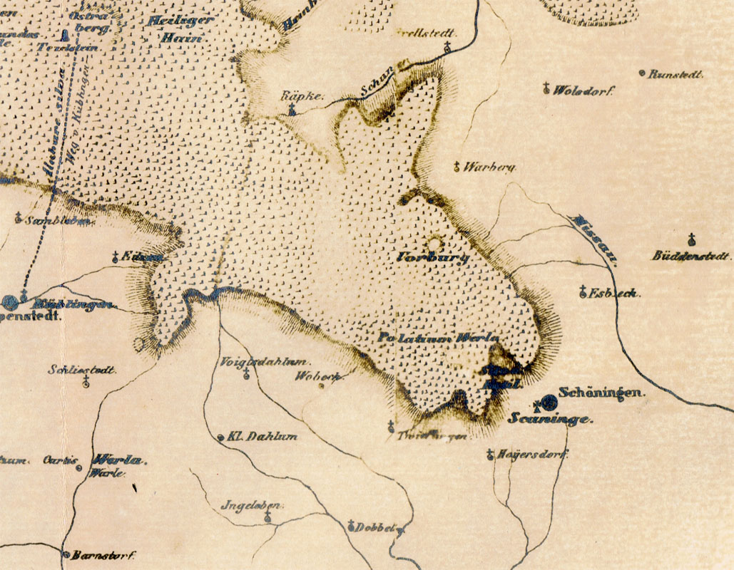 König Heinrich I. nahm (919) die Königskrone an, die sein Vater ausgeschlagen hatte. Dem großen Fürsten, einem der kräftigsten Ahnherren unseres noch blühenden Fürstenstammes, war die schwere Aufgabe vorbehalten, das Reich gegen seine gefährlichsten Feinde, die Ungarn, zu schützen, die unter schwächeren Kaisern die Züge in das Innere des Reiches und auch zu unserm Gauen sich schon gebahnt hatten. Auf der östlichen Spitze des Elmes, von wo aus der Heerweg zwischen diesem Walde und der Asse südöstlich bis zu dem Uebergange über die Bode bei Staßfurt, wie ein großer Theil des alten Nordthuringaues und die nördlich nach dem Drömlinge zu belegenen Gegenden mit unzähligen Ortschaften gewahrt werden können, finden sich noch jetzt geräumige Wälle einer längst zerstörten Feste; hier finden sich über Warberg und Schliestedt die Ueberbleibsel alter Außenwerke; von diesem Berge hinab ergießt sich ein, in der Erzählung der Kämpfe mit den Ungarn denkwürdiger Bach: die Missau — und hier ist es, wo allen Umständen nach die kaiserliche Pfalz Werla gelegen gewesen 4). Sie war Heinrich, wie seinen nächsten Nachfolgern, ein Lieblingssitz. Hier ist die erste Höhe, welche den von SO in das Land faIlenden Ungarn entgegentritt und von hieraus konnte der Weg, welche ihre Schwärme von der Bode her in das Innere Ostsachsens zu nehmen pfIegten, auf das Genaueste verfolgt werden. Unter dieser Feste lagerte das feindliche Heer, das seine Streifereien bis an die Grenzen des Balsamergaues — den Drömling — unternahm, als der König bei Radi nicht fern von der Oker 5) (Rethen) Hülfstruppen an sich zog, den Feind überfiel, und dann in wiederholten Kämpfen über die Saale bei Merseburg hinaustrieb 6). Vorher schon hatte der König eine Reihe von Wehrstätten, um dem Volke bei plötzlichen Ueberfällen einen sicheren Zufluchtsort zu gewähren, einrichten und sie mit einem Theile des Landvolkes besetzen lassen. In einer Reihe von Festungen, deren Trümmern noch mit der Benennung »Hünenburgen« bezeichnet werden, sind uns, namentlich auch an beiden Seiten des Elmes, Spuren solcher Vertheidigungswerke aufbewahrt, die zum Theil vom Elme her ülberschauet werden konnten 7).