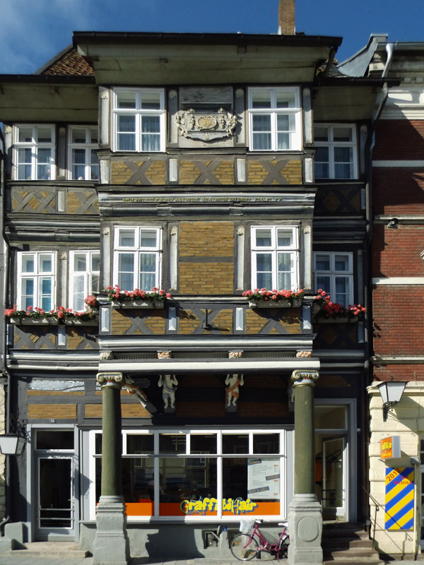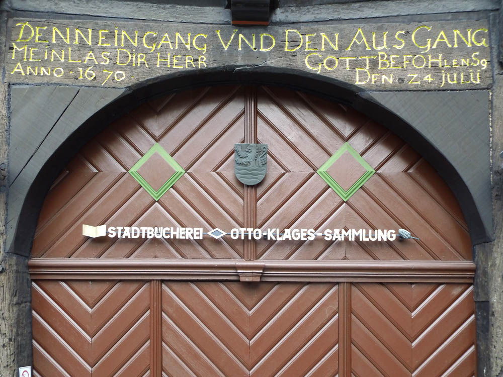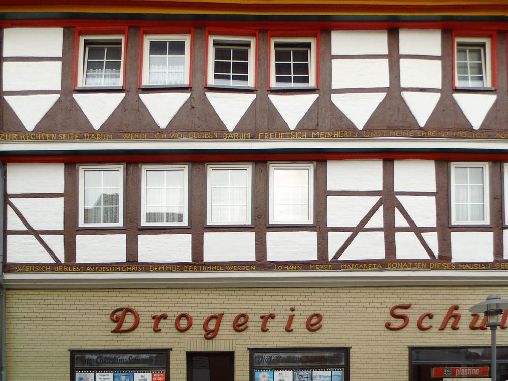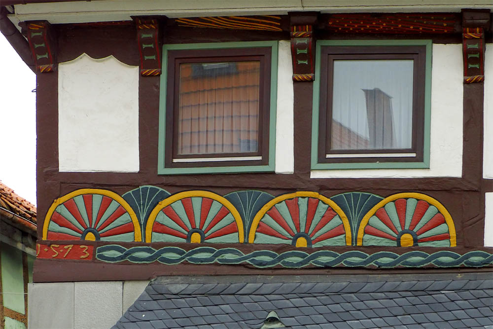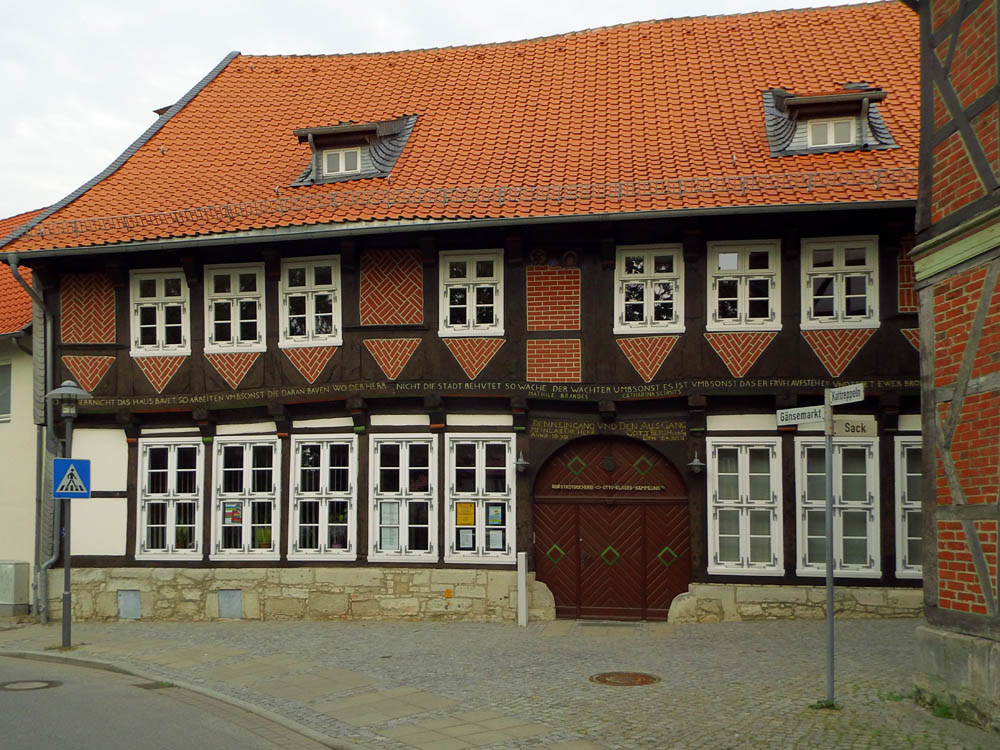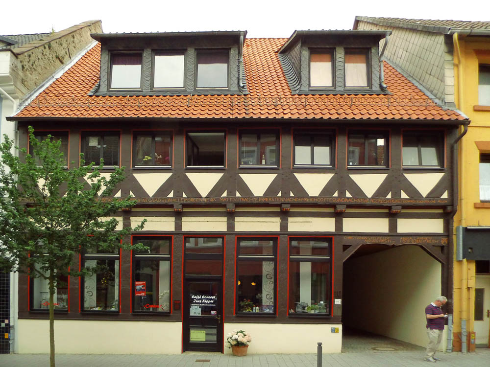 An vielen Fachwerkhäusern hat sich prächtiger Schmuck erhalten. Zum Teil sind noch Anklänge an die Gotik vorhanden. Das gilt für Schiffskehlmuster zwischen den Knaggen, wie sie sich in einfacher Form unter einem Fächerfries an d n Häusern Am Markt 11 (Schuhhaus Eilers) und Neue Straße 49 erhalten haben. Da diese Sohmuckformen in ganz ähnlicher Form an dem Haus in Helmstedt Holzberg 17 aus dem Jahre 1561 vorkommen, ist anzunehmen, daß sie in Königslutter ungefähr um die gleiche Zeit entstanden sind. Fast ebenso alt dürfte das Haus Marktstraße 21 (Blumenhaus Sammann) sein, dessen Erbauungsjahr 15 . . leider schon vor 100 Jahren nicht mehr entzifferbar war. Hier schmücken neben Schiffskehle und Tauband Flechtbänder, Zahnschnitt, Beschlagwerk mit Hopfendarstellungen und interessante Steinsetzungen das stark vorkragende Haus. Wahrscheinlich besaß dieses auch einen Erker. Schöne Rosetten, Perlschnüren, Flecht- und Taubänder zeigen die Häuser Gänsemarkt 1 (1573/1669), Sack 5 (1604), das der Amtmann Christoph Vögding erbauen ließ, und - leider unbemalt - das alte Handelshaus an der Ecke Westernstraße/Neue Straße aus dem Jahre 1603. Das schönste Haus aus der Barockzeit in Königslutter ist zweifellos das Haus Am Markt 14 (Frisiersalon Beese), das der Amtmann Leidenfrost 1674 errichten ließ. Das hohe, schmale Haus zeigt einen von einem Wappen geschmückten und mit kleinen Muscheln versehenen prächtigen Erker, der auf zwei angeblich aus der Schoderstedter Kirche stammenden Holzsäulen ruht und von vier Schleier tragenden Knaben gestützt wird. Bemerkenswert ist auch das Portal des Hauses Marktstraße 2 (Café am Markt) mit zwei fliegenden Engeln aus dem Jahre 1674. Viele Häuser weisen auch interessante lnschriften auf, die meistens Texte aus der Bibel, am häufigsten „Wer Gott vertraut, hat wohl gebaut . . ." sowie die Namen der Erbauer und den Zeitpunkt der Errichtung des Bauwerks enthalten.