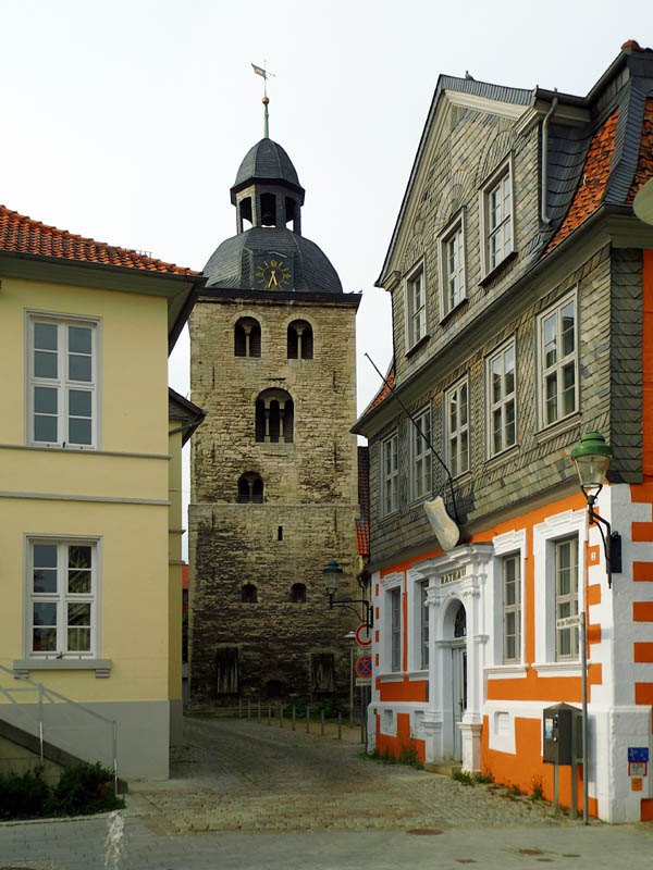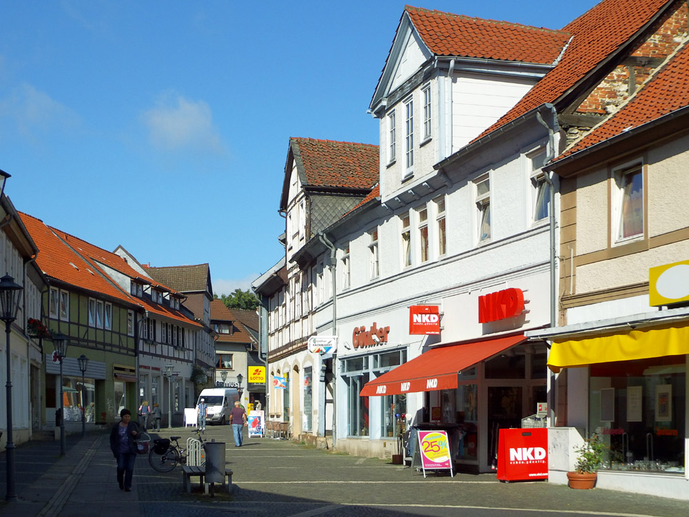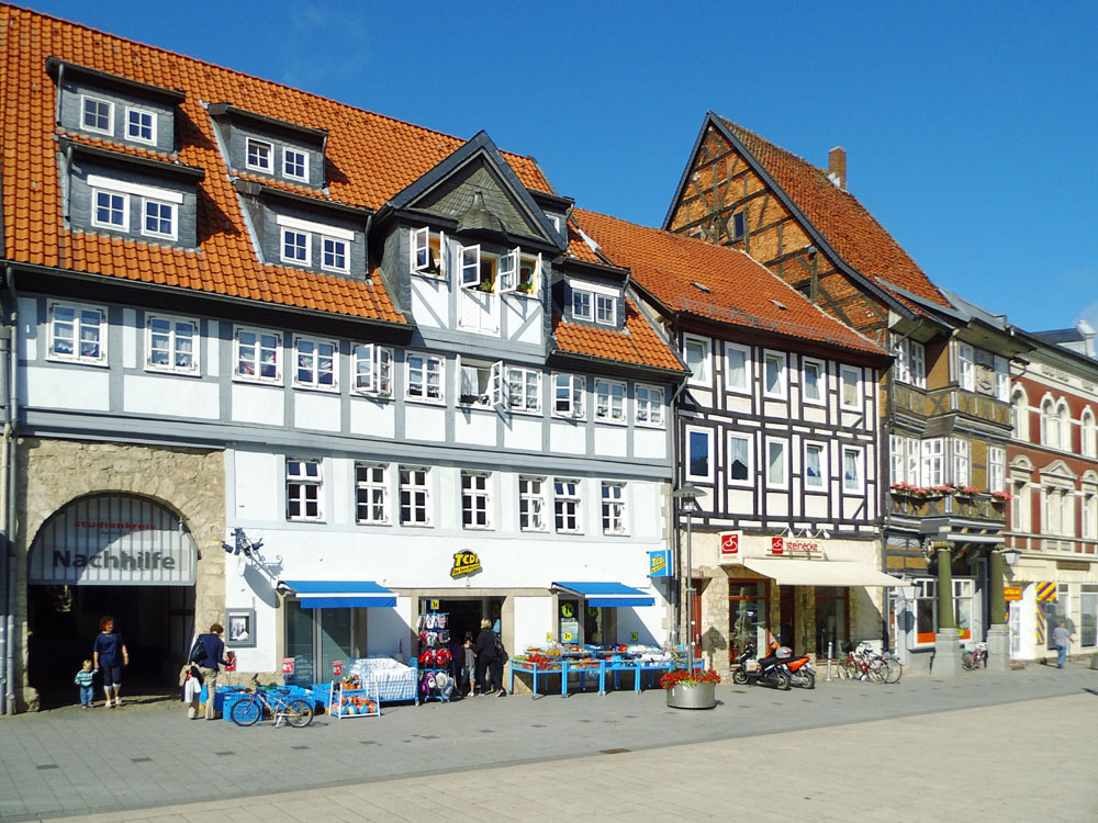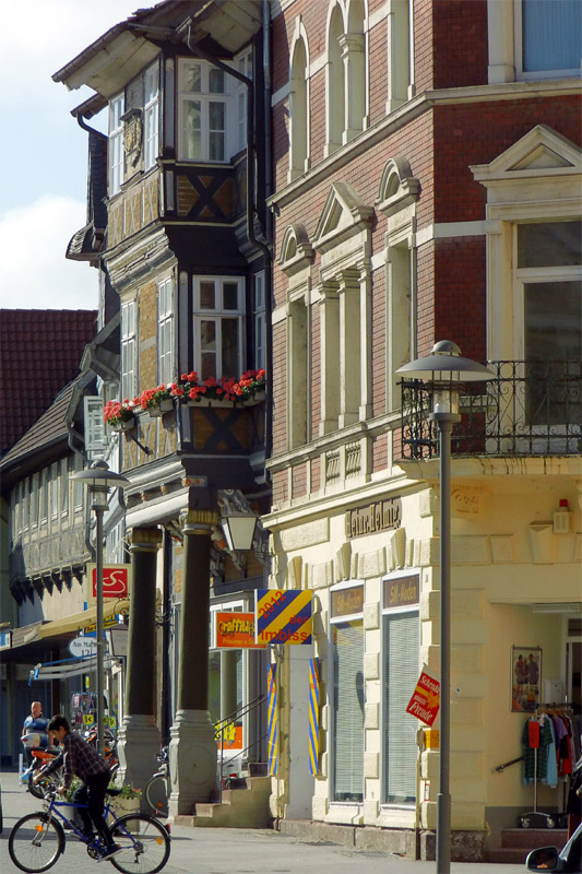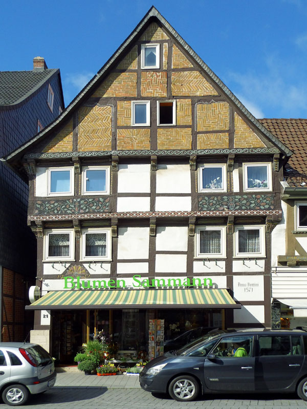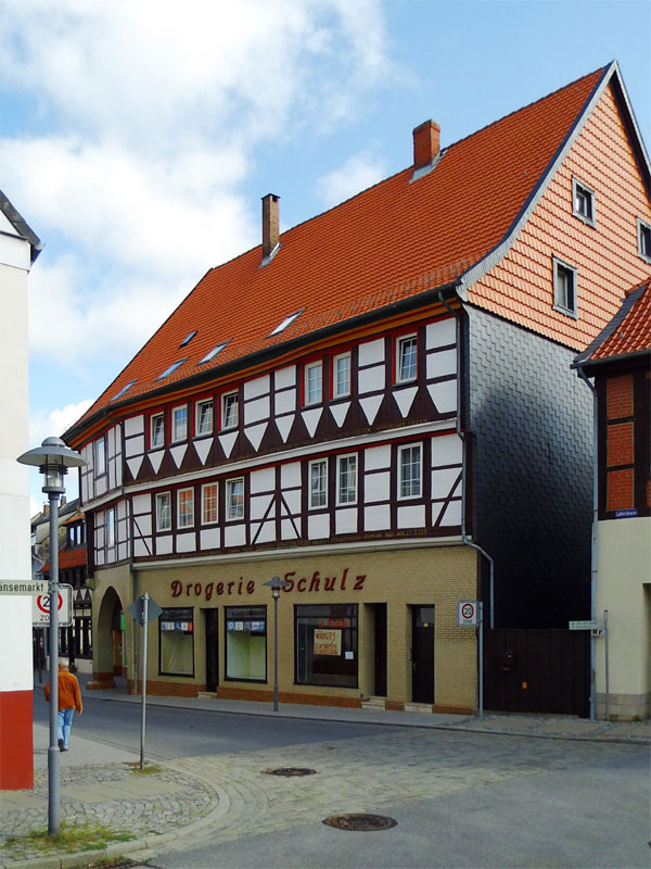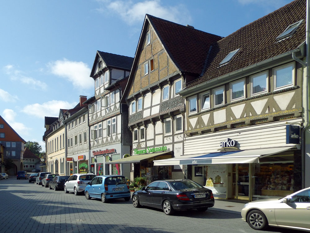 An vielen Fachwerkhäusern hat sich prächtiger Schmuck erhalten. Zum Teil sind noch Anklänge an die Gotik vorhanden. Das gilt für Schiffskehlmuster zwischen den Knaggen, wie sie sich in einfacher Form unter einem Fächerfries an d n Häusern Am Markt 11 (Schuhhaus Eilers) und Neue Straße 49 erhalten haben. Da diese Sohmuckformen in ganz ähnlicher Form an dem Haus in Helmstedt Holzberg 17 aus dem Jahre 1561 vorkommen, ist anzunehmen, daß sie in Königslutter ungefähr um die gleiche Zeit entstanden sind. Fast ebenso alt dürfte das Haus Marktstraße 21 (Blumenhaus Sammann) sein, dessen Erbauungsjahr 15 . . leider schon vor 100 Jahren nicht mehr entzifferbar war. Hier schmücken neben Schiffskehle und Tauband Flechtbänder, Zahnschnitt, Beschlagwerk mit Hopfendarstellungen und interessante Steinsetzungen das stark vorkragende Haus. Wahrscheinlich besaß dieses auch einen Erker. Schöne Rosetten, Perlschnüren, Flecht- und Taubänder zeigen die Häuser Gänsemarkt 1 (1573/1669), Sack 5 (1604), das der Amtmann Christoph Vögding erbauen ließ, und - leider unbemalt - das alte Handelshaus an der Ecke Westernstraße/Neue Straße aus dem Jahre 1603. Das schönste Haus aus der Barockzeit in Königslutter ist zweifellos das Haus Am Markt 14 (Frisiersalon Beese), das der Amtmann Leidenfrost 1674 errichten ließ. Das hohe, schmale Haus zeigt einen von einem Wappen geschmückten und mit kleinen Muscheln versehenen prächtigen Erker, der auf zwei angeblich aus der Schoderstedter Kirche stammenden Holzsäulen ruht und von vier Schleier tragenden Knaben gestützt wird. Bemerkenswert ist auch das Portal des Hauses Marktstraße 2 (Café am Markt) mit zwei fliegenden Engeln aus dem Jahre 1674. Viele Häuser weisen auch interessante lnschriften auf, die meistens Texte aus der Bibel, am häufigsten „Wer Gott vertraut, hat wohl gebaut . . ." sowie die Namen der Erbauer und den Zeitpunkt der Errichtung des Bauwerks enthalten.