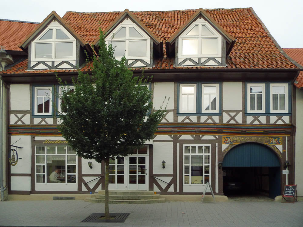 Tradition und Stil bewahrt hatte. Das Fachwerk hatte er dunkel aufgetönt, die
