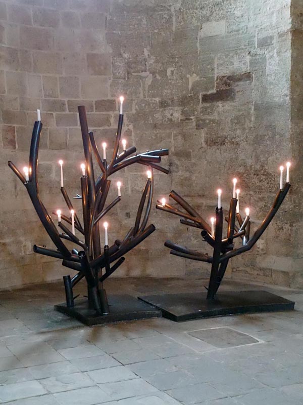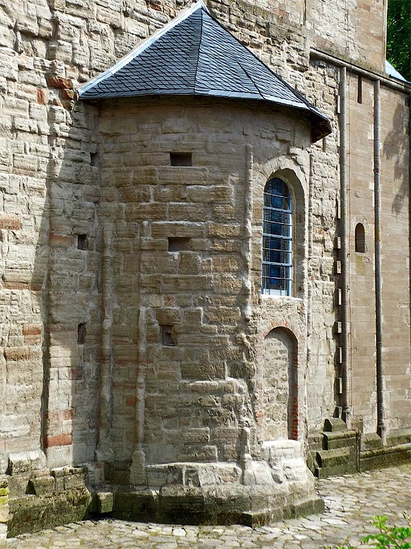 Gleichzeitig mit dieser Restauration sind endlich auch noch die beiden, zu den Seiten der westlichen Nische ausgeführten zierlichen Thürme. Der Unterbau derselben, welcher bis zur Höhe des Mittelschiffes reicht, ist viereckig, mit rundbogigem Fries, mit Liseen auf den Ecken und Halbsäulchen zwischen diesen. Darüber erhebt sich ein achteckiges Obergeschoß, welches mit je drei schlanken Halbsäulchen auf den Ecken geschmückt ist. Ein hoher Zwischenbau verbindet beide Thürme.