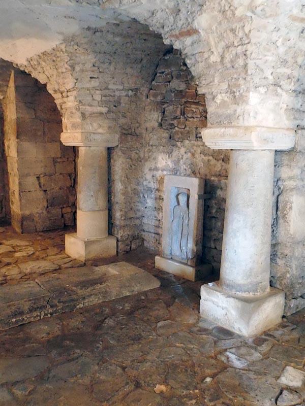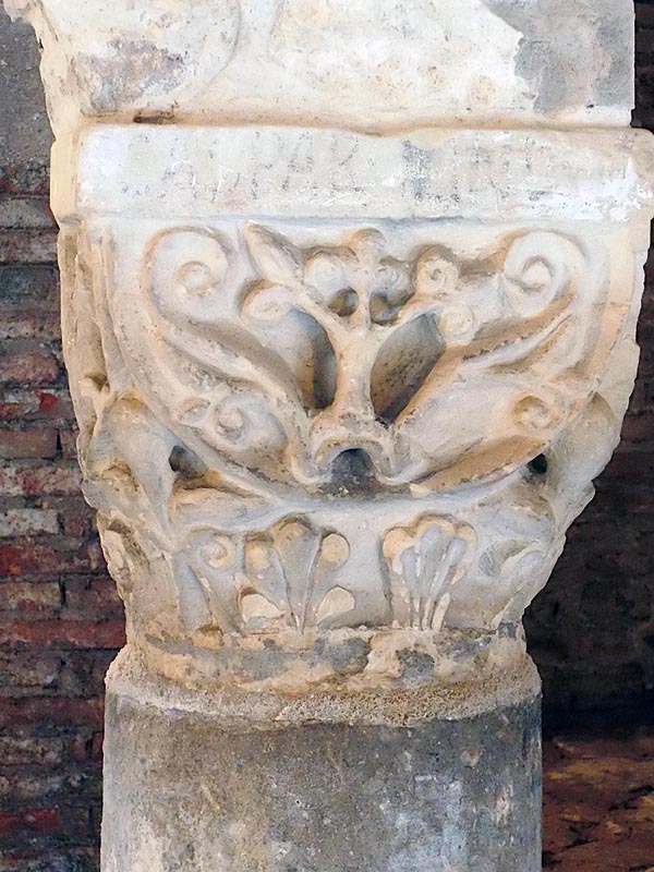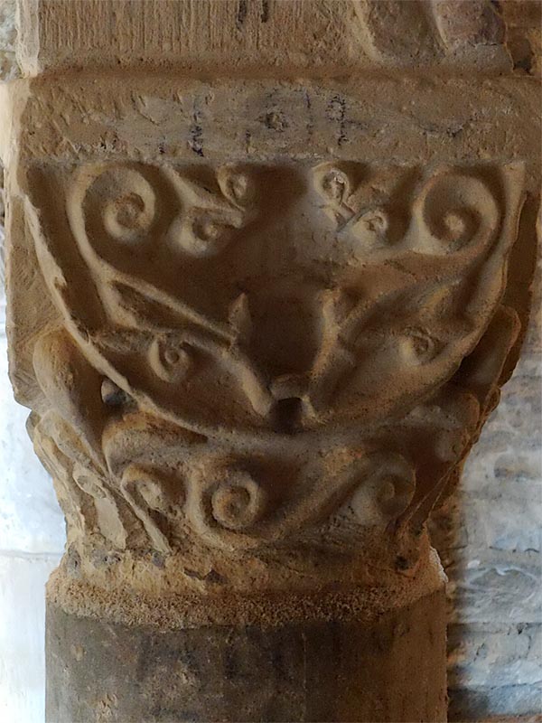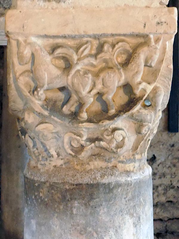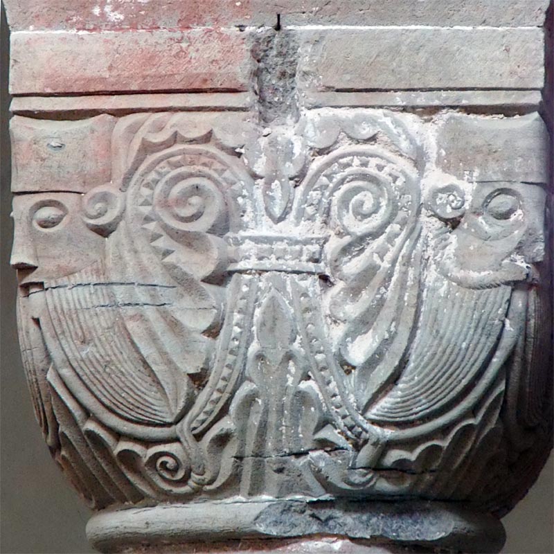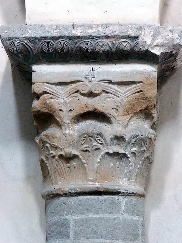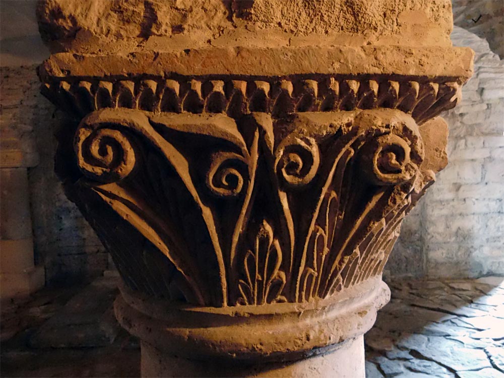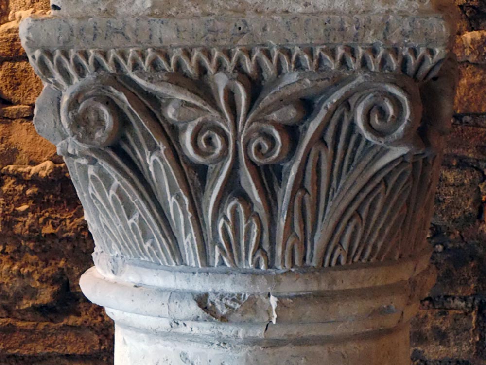 scheinen. Nur zwei von diesen Säulen haben noch ihre alten Kapitäle; das eine ist ein Blätterkapitäl, ungefähr den Formen eines römischen Kapitäles verwandt; das andre hat die Grundform eines unten abgestumpften Würfels, dessen Seitenflächen mit sorgfältig ausgeführten und zum Theil frei vorspringenden Verzierungen, Arabesken und Thierfiguren, versehen sind. Von Stuck-Ueberzug findet sich keine Spur. Da es uns an eigner sicherer Anschauung fehlt, so wagen wir kein Urtheil über die Zeit, in welcher die Gruftkirche erbaut ist, auszusprechen; doch dürfte es als wahrscheinlicher anzunehmen sein, daß sie nicht der ursprünglichen Anlage der Kirche, sondern dem im zwölften Jahrhundert Statt gehabten Umbau angehört.