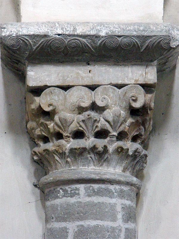 wie die, welche sich im Schiff der Kirche der Huyseburg erhalten zeigt, und die Säulen waren gewiß in derselben Weise mit den nächststehenden Pfeilern durch kleinere Halbkreisbögen verbunden, welche den Raum unter dem großen Bogen ausfüllten. Wie es scheint, wurden diese kleineren Bögen erst bei den letzten Veränderungen der Kirche herausgenommen, da man wenigstens auf der Nordseite in den somit gewonnenen großen Bogenöffnungen Fenster angelegt hat. - Die Kapitäle dieser Säulen sind (soweit ihre ursprüngliche Gestalt erhalten ist) mit einem Blattwerk, zumeist auch mit kleinen Voluten, geschmückt, was noch immer an die Formen der antiken Kunst erinnert und nichts von speziell byzantinischer Verzierungsweise enthält; die Blätter sind wenig ausladend, von nicht sonderlich genauer Zeichnung, doch schon recht gut ausgearbeitet; an einigen dieser Blätter wird, was als besondere Eigenthümlichkeit zu bezeichnen ist, die mittlere Rippe derselben durch ein Kreuz von nicht starkem Relief gebildet. Das Deckgesims dieser Kapitäle hat durchweg dieselbe Form: eine Platte und eine große, scharf vorspringende Schmiege; letzteres Glied ist allenthalben mit einer, Voluten- oder Muschel-förmig gekrümmten Rankenverzierung geschmückt. -