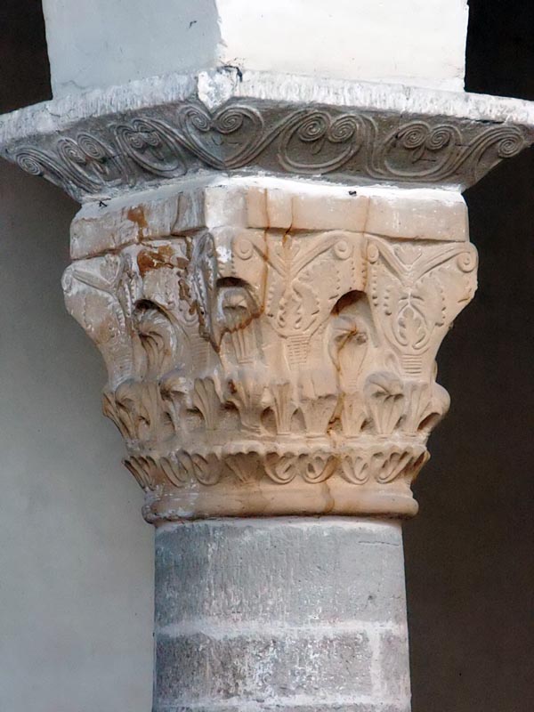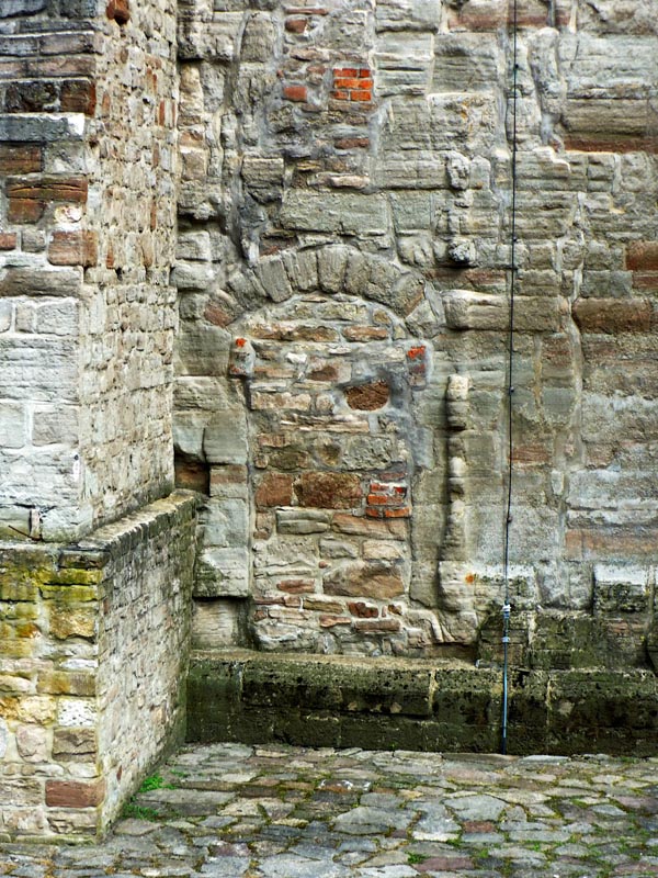 Eine bedeutende Veränderung erhielt diese Anlage, wie bemerkt, in der späteren Zeit des byzantinischen Styles, und zwar zunächst durch die Bedeckung mit einem rundbogigen Kreuzgewölbe. Letzteres ist zwar (ebenso wie das spitzbogige Gewölbe des Chores) nicht mehr vorhanden, doch sind die Spuren seines Ansatzes an den Wänden noch deutlich zu erkennen. Daß dasselbe nicht ursprünglich zur Anlage der Kirche gehörte, geht außer andren Umständen, auch daraus hervor, daß die älteren, in regelmäßigen Abständen angeordneten Fensterreihen an den oberen Wänden des Mittelschiffes (deren Spuren man noch am Aeußeren deutlich sieht), um dem Ansatz der Gewölbe genügenden Platz zu verschaffen, vermauert und statt ihrer andre, eben wie jene im Halbkreisbogen überwölbte Fenster in den Lünetten des Gewölbes eröffnet wurden. Erhalten sind von dieser Anlage nur noch die, oberhalb der Pfeiler des Schiffes vorspringenden Pilaster, welche die Gurte des Gewölbes unterstützten; sie ruhen auf Consolen, welche zierlich, im Style der entwickelt byzantinischen Kunst, ornamentirt