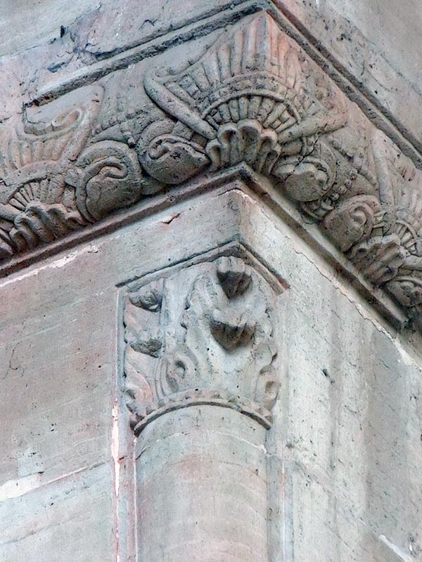 Indem hiedurch der Kirche schon ein wesentlich verschiedenes Aussehen gegeben war, bestrebte man sich jedoch, auch den älteren Theilen derselben einen mit dem Styl der neuen Theile harmonirenden Charakter zu geben, und man wandte dabei ein Mittel an, welches in der Geschichte der mittelalterlichen Architektur gewiß als ein höchst seltnes Beispiel erscheint. Man umgab nemlich die, wie es scheint: durchweg ganz wohl erhaltenen Kapitäle und Deckglieder der Säulen des Schiffes mit einem festen Stuck, in welchem sodann neue Ornamente, dem Style der Zeit gemäß, ausgegraben wurden. So stehen noch gegenwärtig einige dieser umgewandelten Kapitäle in ihrer vollständigen Form, beträchtlich stärker als die älteren, da; bei den meisten jedoch ist der Stuck gänzlich oder in größeren oder geringeren Massen wieder herabgefallen, und sie zeigen nun die alte Form und das darüber gezogene neue Gewand in friedlicher Ruhe nebeneinander (Vgl.Taf.VII, 1.). Die neubyzantinischen Ornamente der Kapitäle bestehen in phantastischen Köpfen, mit Blattwerk arabeskenhaft verbunden, in üppig geschweiften Blattgewinden u. dgl.; ebenso sind die Deckgesimse zum Theil mit zierlich bunten Verzierungen versehen *). Wie aber dieses technische Verfahren, so ist nicht minder der, dem Mittelalter sonst so fremde feindliche und bis zum Uebermuth gesteigerte Sinn, mit dem hier die alte, an sich ganz gute Form verdeckt ward, höchst auffallend und läßt schon hierin mit Bestimmtheit