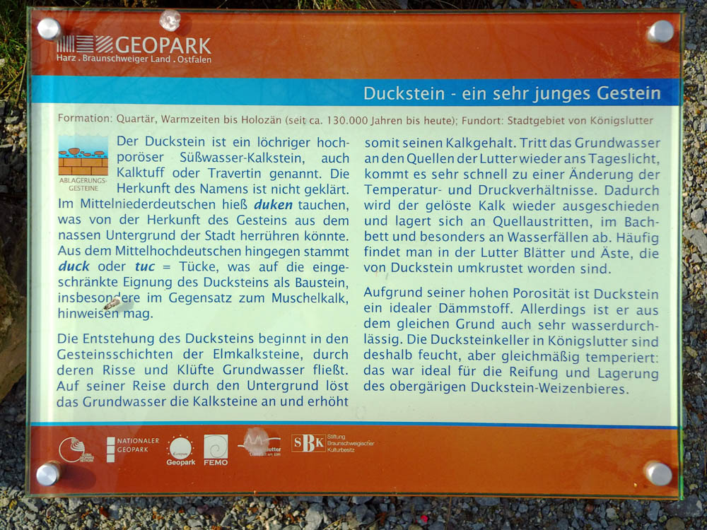 Vor Beginn des 17. Jahrhunderts bis Mitte des 19. Jahrhunderts wurde in dem Städtchen Königslutter ein Bier gebraut, das seinen Namen nach dem Kalksinter erhielt, auf dem die Stadt steht und den man Duckstein nannte.