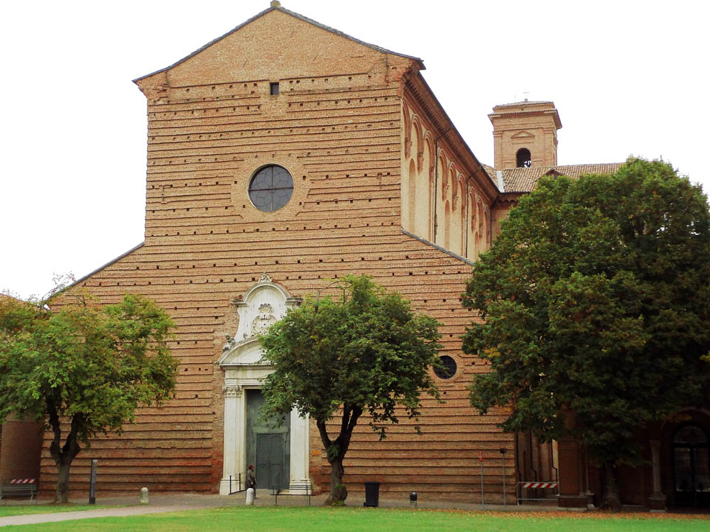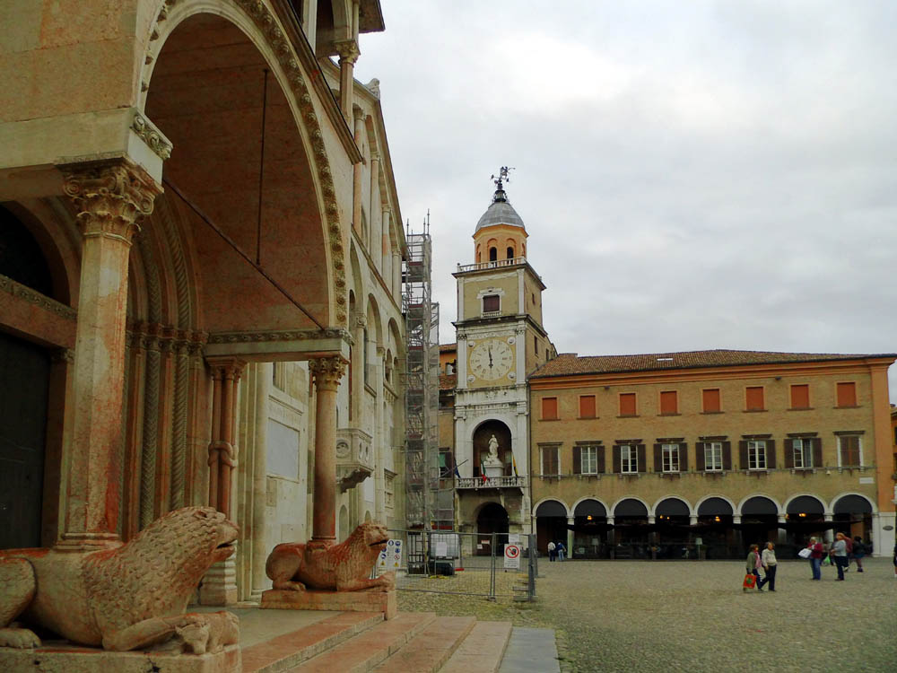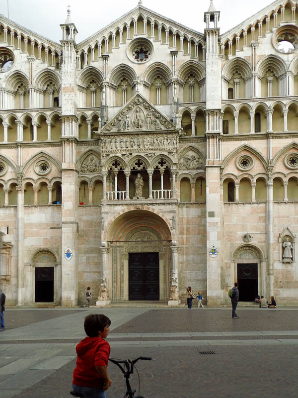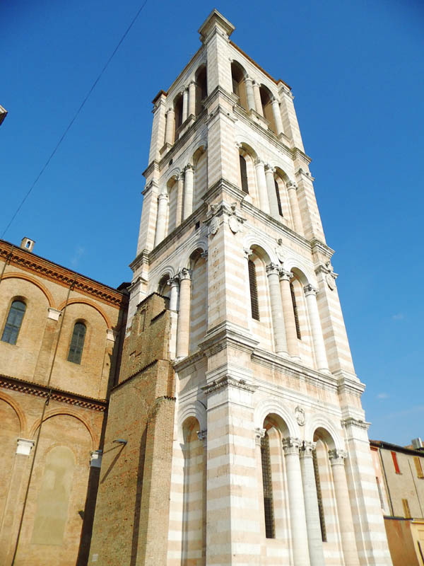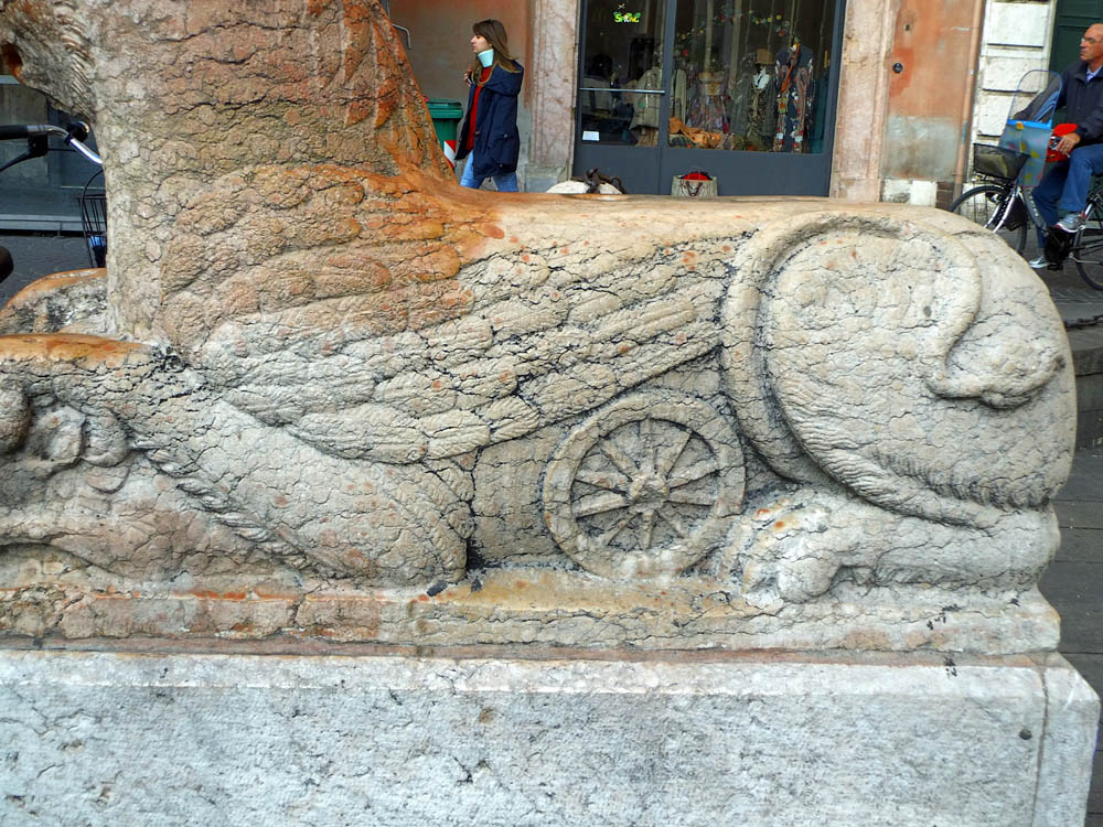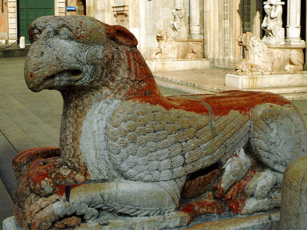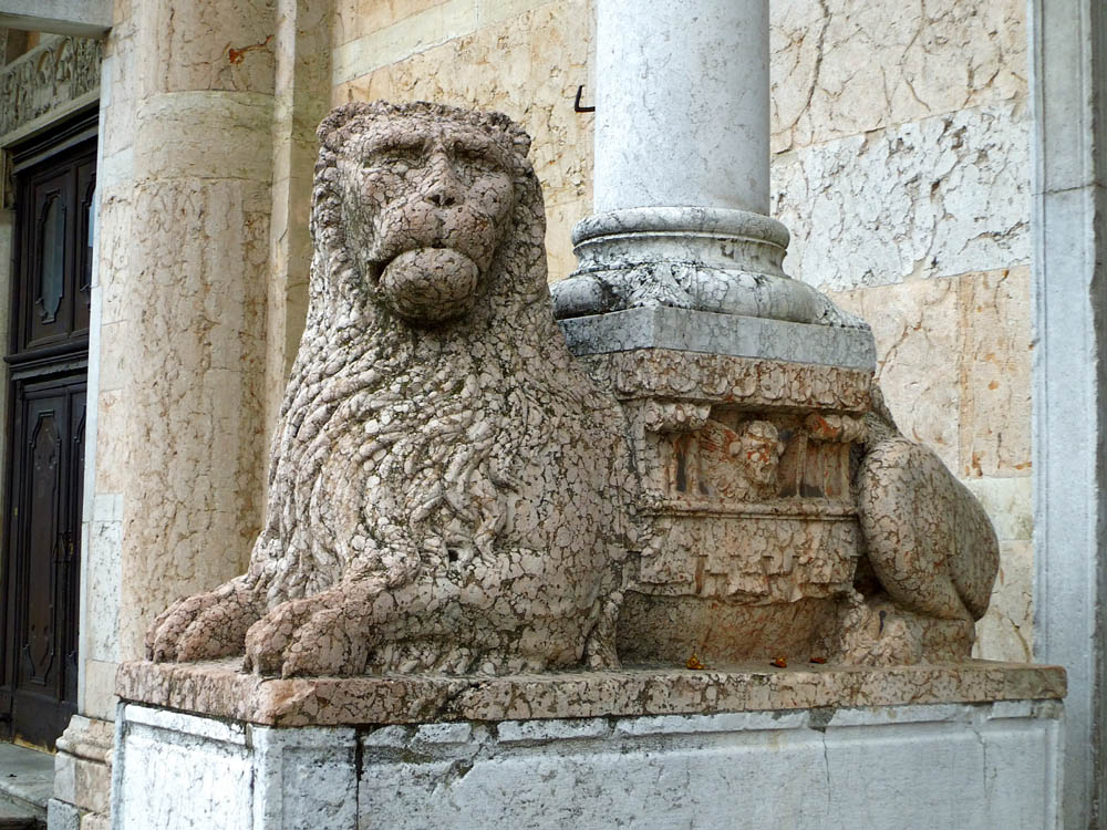 *) Cittadella: Guida pel forestiero in Ferrara, Ferrara 1873: Poggia questo avancorpo (die Vorhalle) Sopra 4 colonne, due delle quali (quelle dinanzi) si basano sopra grottesche figure accovacciate sul dorso di grandi leoni accosciati. Questi sostegni minacciavano ruina, essendosi avvallati nel suolo; ma il Rev: Capitolo nel 1829 ve ne fece surrogare de nuovi, accrescendo il diametro delle colonne, e la mole dei telamoni e dei leoni. I vecchi pezzi erano stati affissi alla facciata, ma nel generale ripulimento fattone nel 1842 furono tolti di la e collocati nel cortile dietro il coro. Una di quelle colonne però ed uno di que‘ leoni si abbrucciarono o meglio rimasero calcinati nel 1559 per un incendio di una botteguccia di legno ivi aderente, e ne venne fatta sostituzione per opera dello scalpellino Castorio Gilardoni. Die letztere Notiz ist nicht verständlich. Jetzt stehen die Greife wieder an der Fassade.