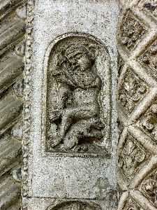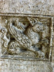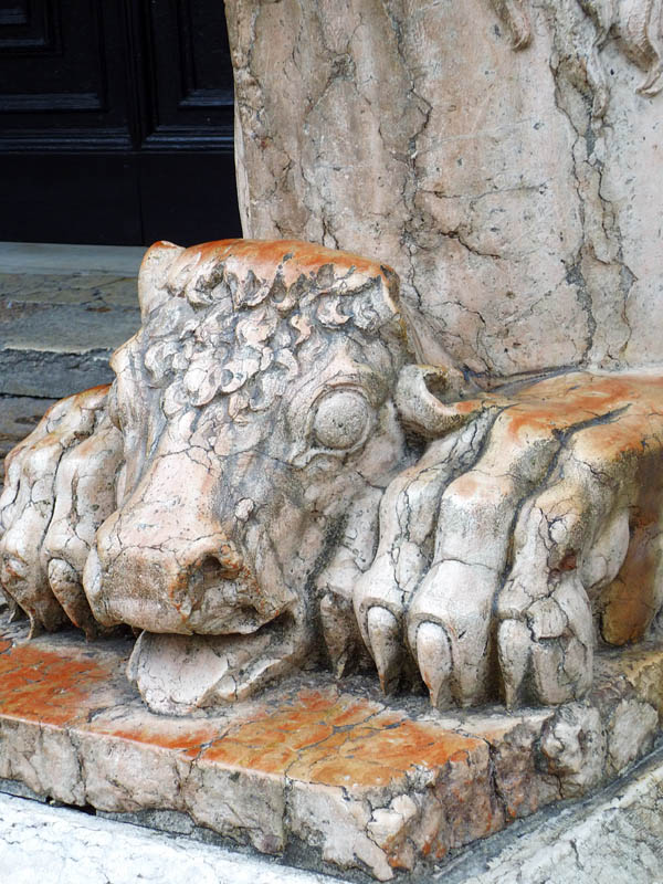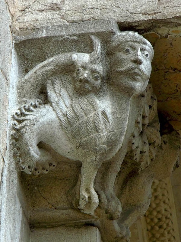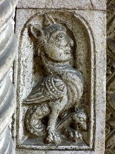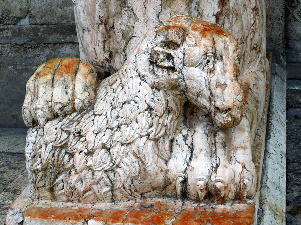Die Löwen, auf welchen der Vorbau jetzt ruht, sind modern, ebenso wie die Säulen und ihr Gebälk. Die ursprünglich an dieser Stelle befindlichen Thiere waren die Greife, welche jetzt an den beiden äussersten Enden der Fassade aufgestellt sind. Von diesen Greifen hat der eine zwei Stiere und einen Menschen, der andere einen gepanzerten Ritter und sein Pferd in den Klauen, beide sind geflügelt und einer hat an den Seiten Räder, wie sie die Vision des Ezechiel bei den vier Thieren, welche später als Symbole der Evangelisten angenommen wurden, beschreibt. *)