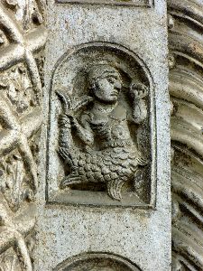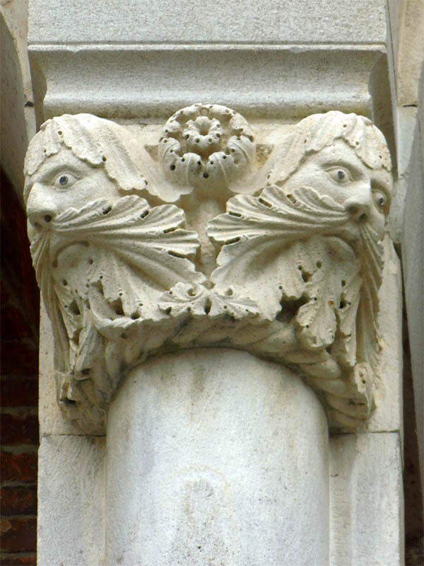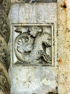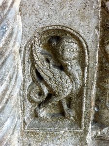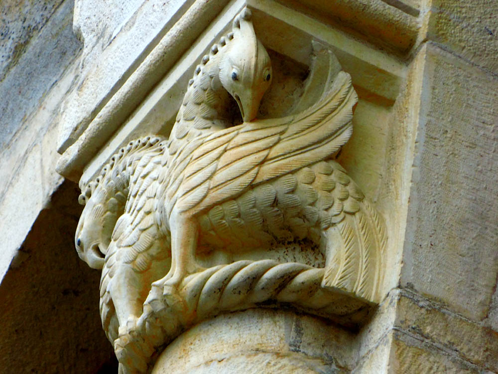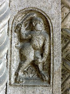 Wir gewahren einen Widder mit Flügeln, dessen Hinterleib in einen Drachenschwanz ausgeht, Menschen mit Fischleibern, Vögel mit Menschenköpfen, einen Mann ohne Kopf mit dem Gesicht auf der Brust, ein satyrartiges Wesen mit Menschenleib und Thierfüssen eine Keule schwingend, einen nackten Mann mit übergrossen Ohren, die Geige spielend und auf einem Hunde sitzend; der Schwanz der Thiere geht häufig wieder in einen Thierkopf über. Auch antike Gestalten kommen vor, einmal eine vorzüglich gearbeitete Chimära und ein Kentaur. Diese Reliefs sind flach und nach den Gesetzen des antiken Reliefstils, d. h. von der vorderen Fläche des Pilasters ausgehend in die Tiefe gearbeitet.
