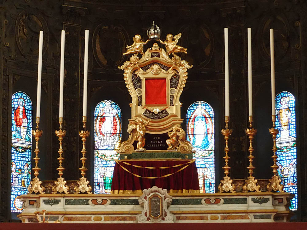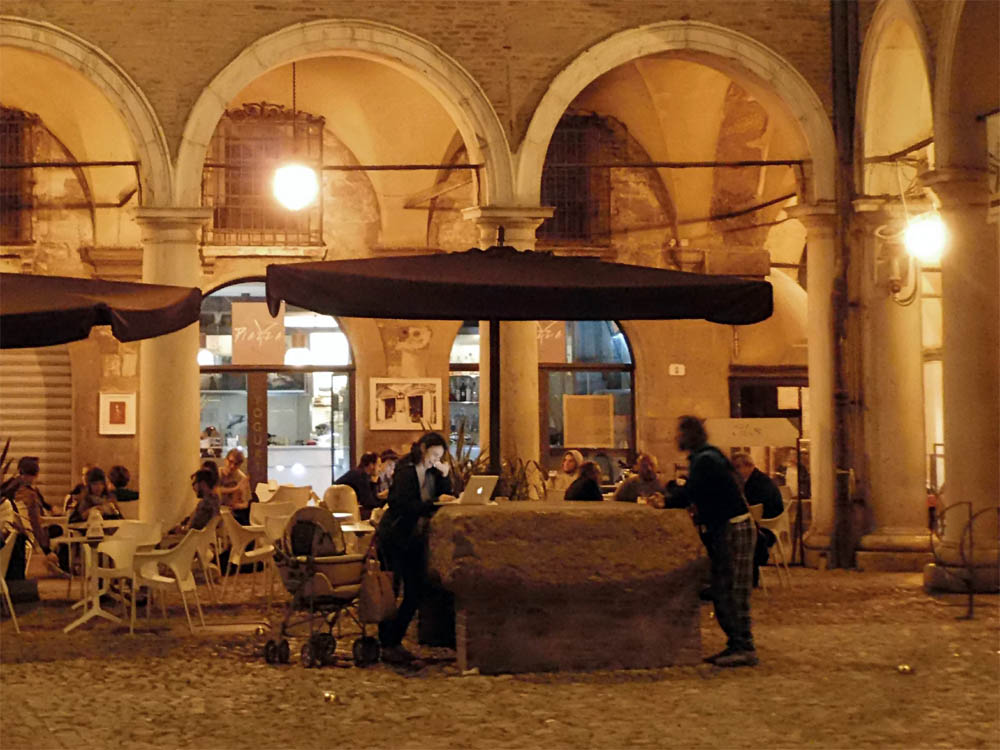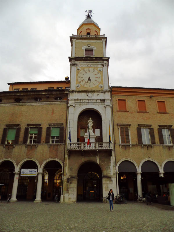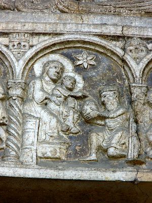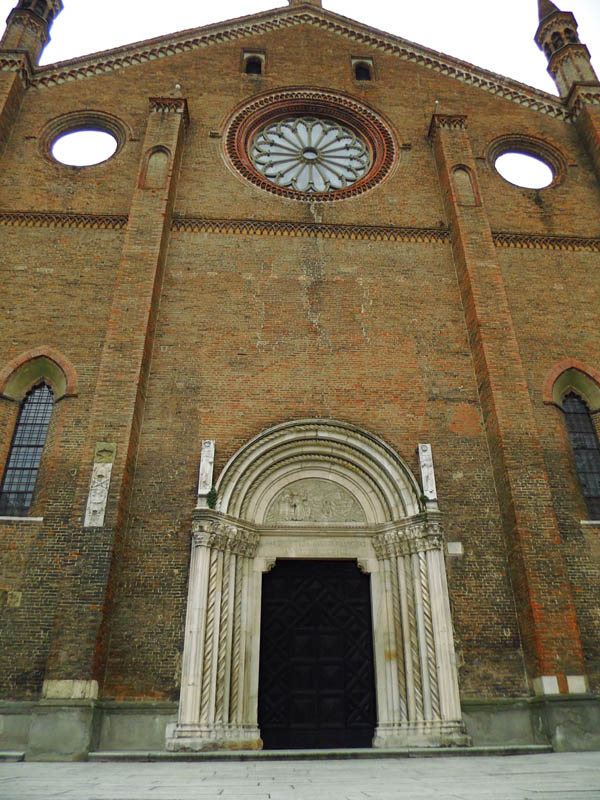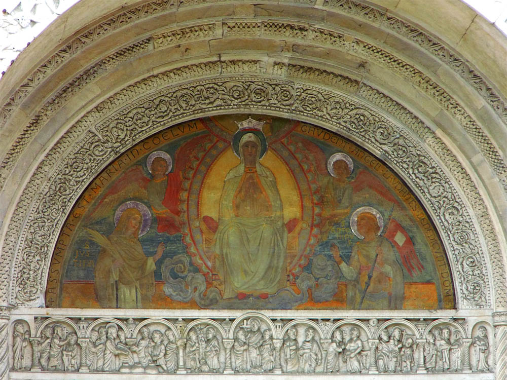 Dieser Portalbau ist noch vollständiger als der von Ferrara, denn über dem ersten Stockwerk befindet sich noch eine in mächtigem Rundbogen überwölbte Loggia, und auch dadurch erscheint er stattlicher, dass er sich auf einer Terrasse von drei Stufen und über einem Sockel erhebt. Die Thürumrahmung ist einfach, die Pfosten sind nur an den Innenseiten mit zwei Relieffiguren verziert, das Blattwerk der Kapitelle ist etwas organischer als in Ferrara. Der Architrav enthält drei Medaillons mit den Halbfiguren dreier gekrönter Frauen in Relief, welche später fälschlich Beischriften mit den Namen der drei theologischen Tugenden erhalten haben. Im Tympanon ist auf einer mittleren oblongen, aufrecht stehenden Platte in Hochrelief die thronende Madonna angebracht, welche das Christuskind vor sich auf